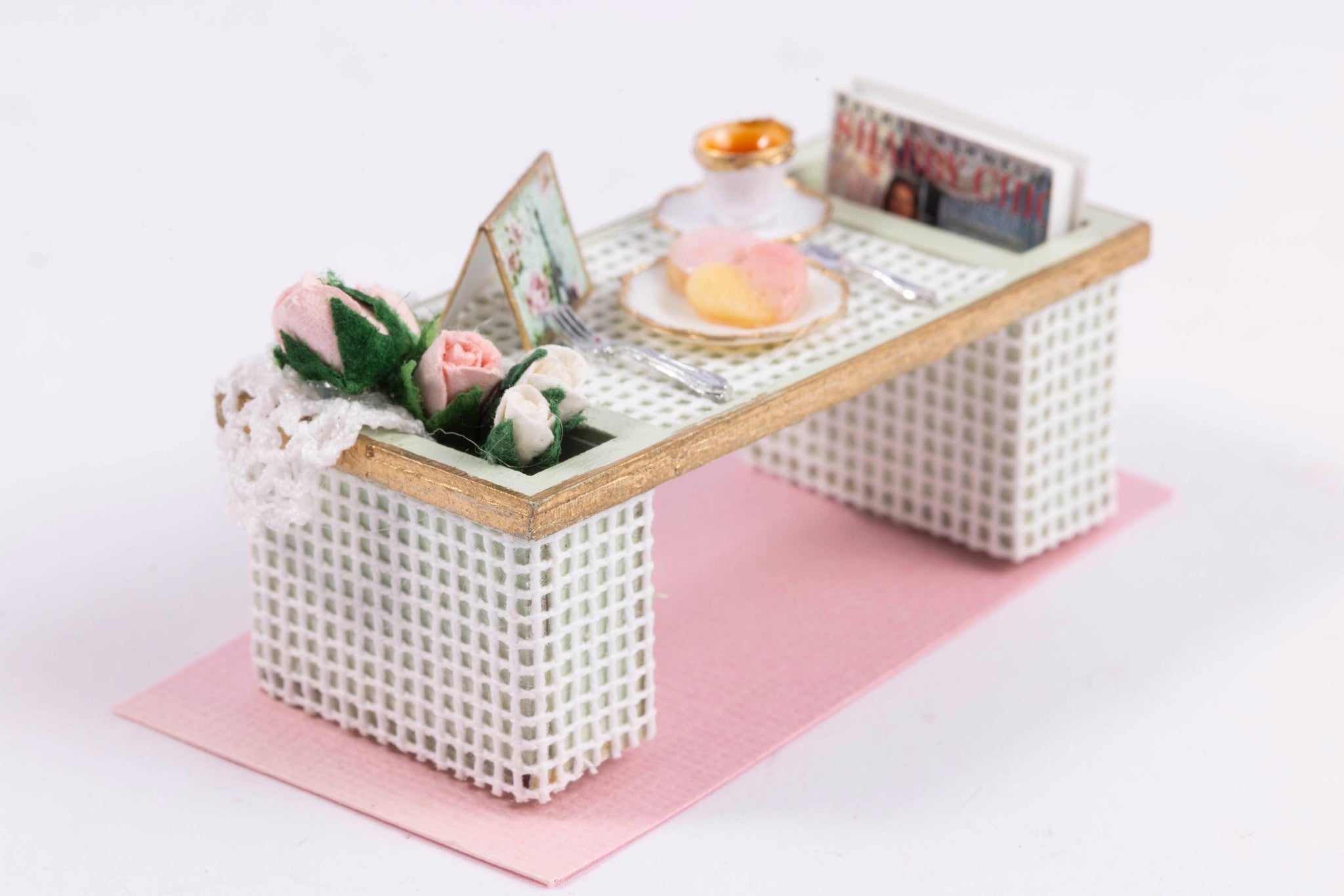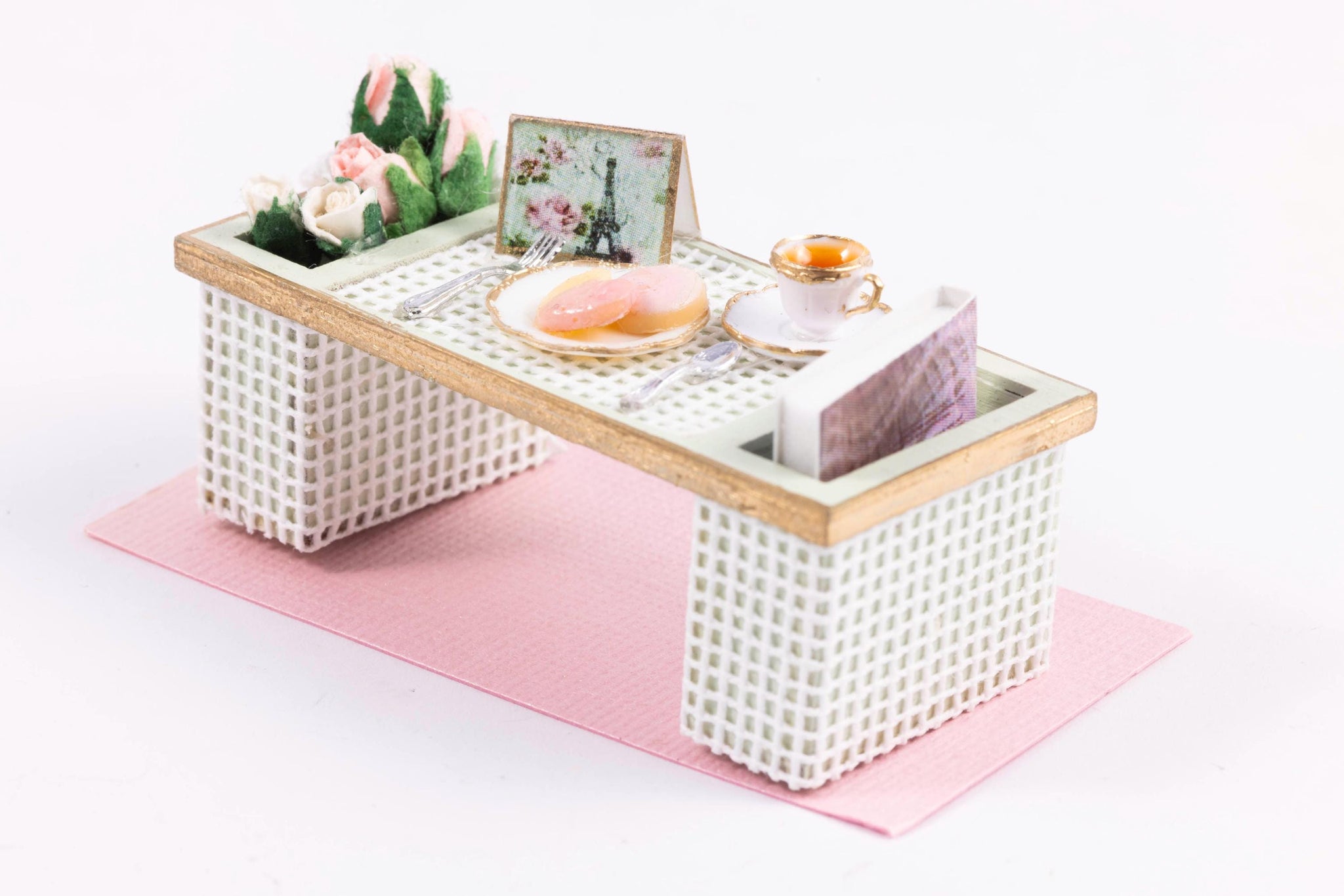 This is a handmade decorated bed tray. There's a post card, roses, book, cookies and tea.