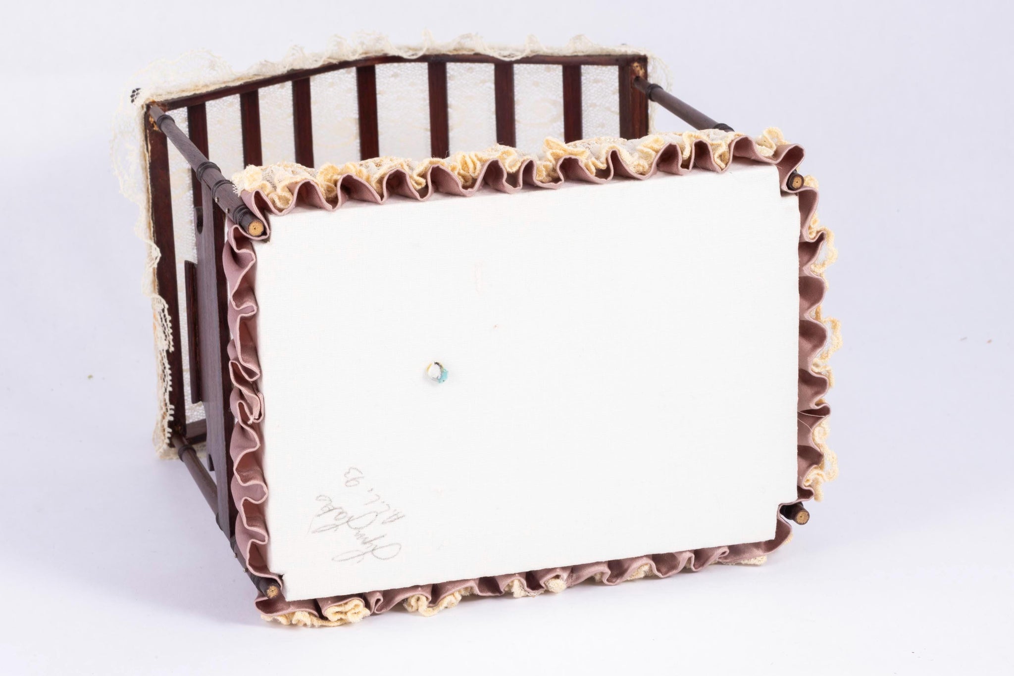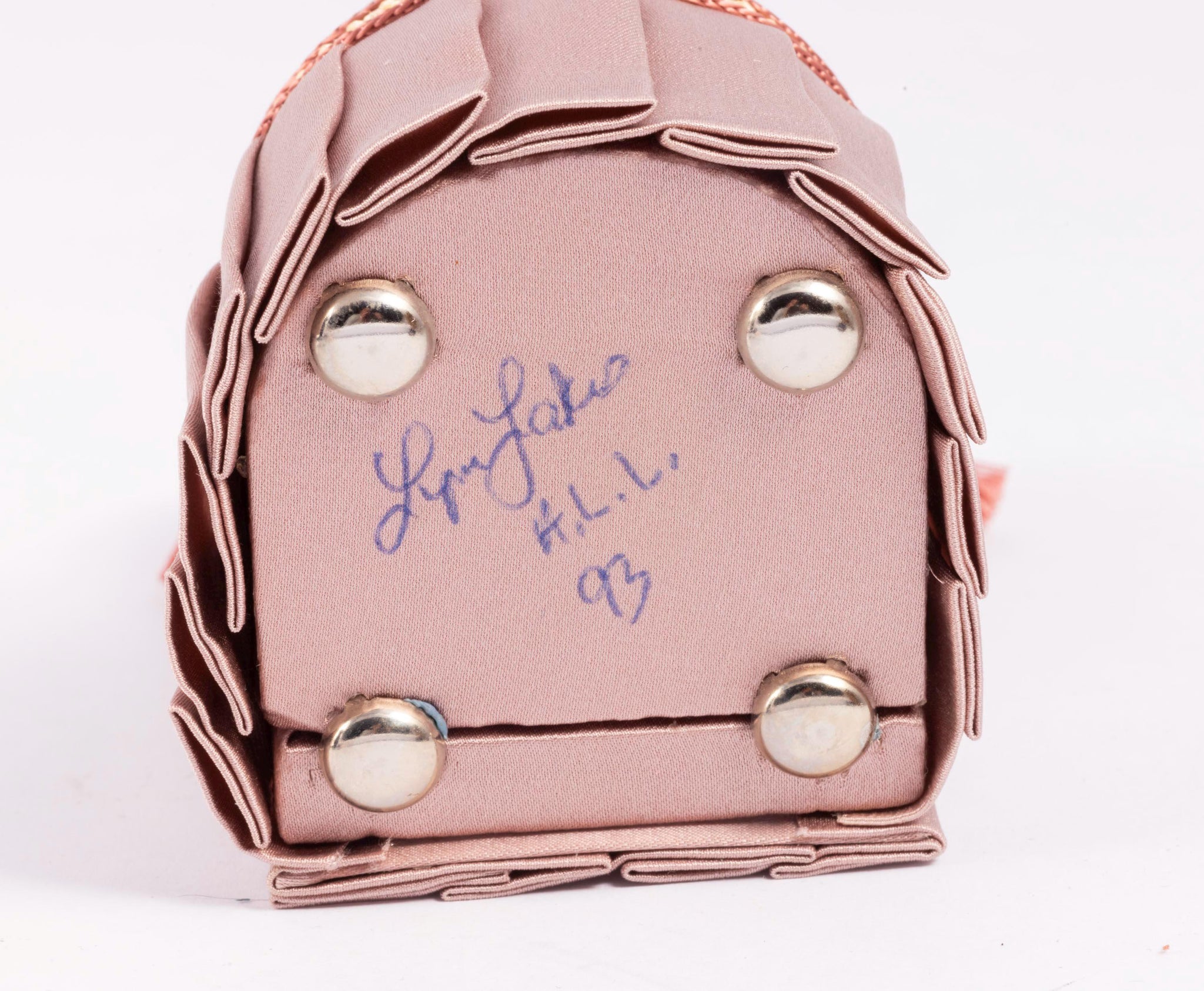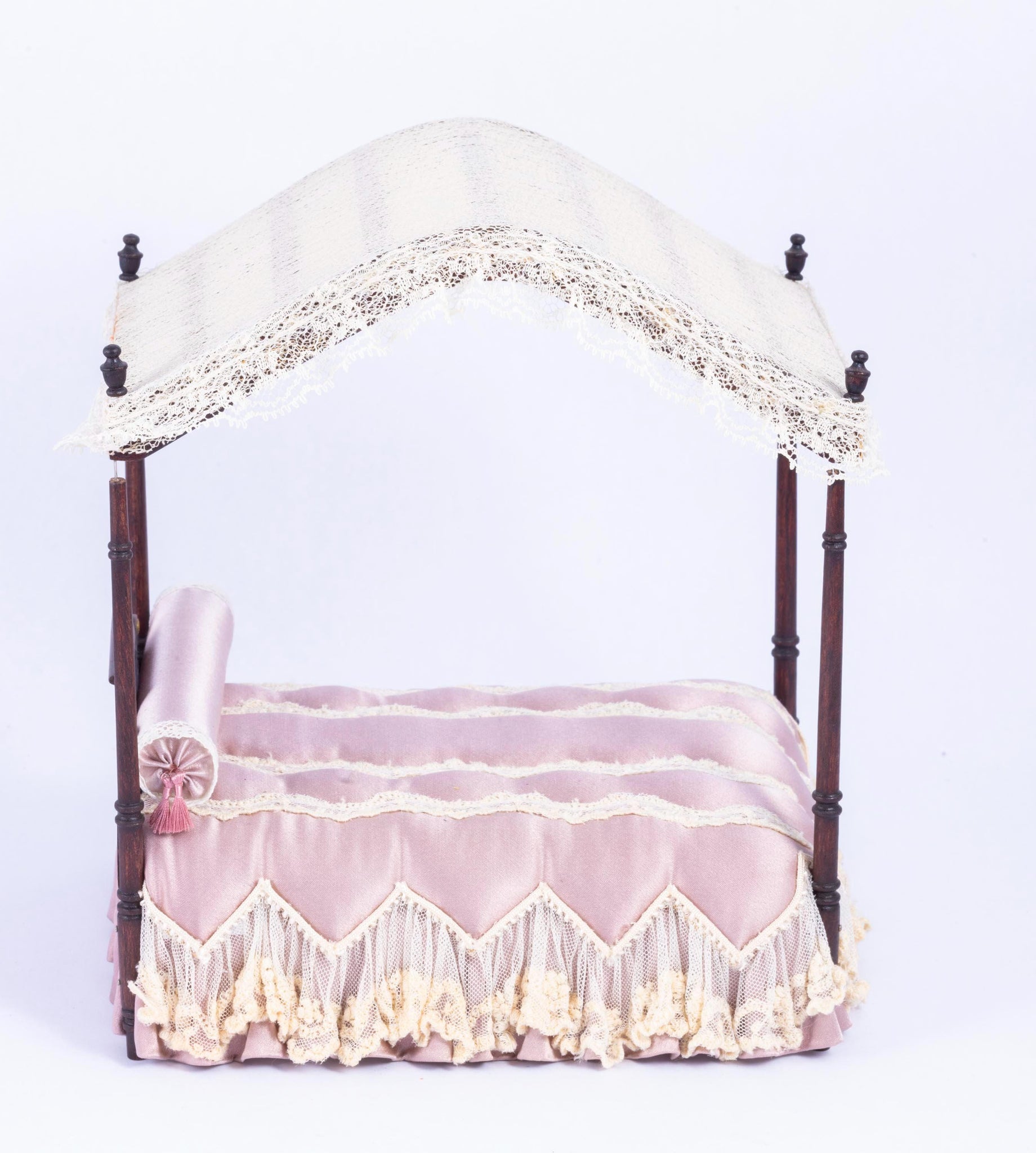 This is a mahogany canopy bed that's been hand dress with silf and lace fabric. The mauve colored bedding is elegant looking with a matching clip chair. Signed and dated Lynn Lakes. The set is fromthe estate of Lee Lefkowitz.