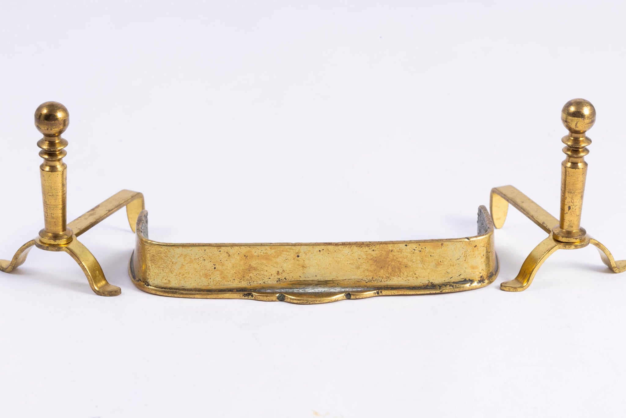This is a brass fireplace andirons and fender set. The brass was made in England, and is vintage.