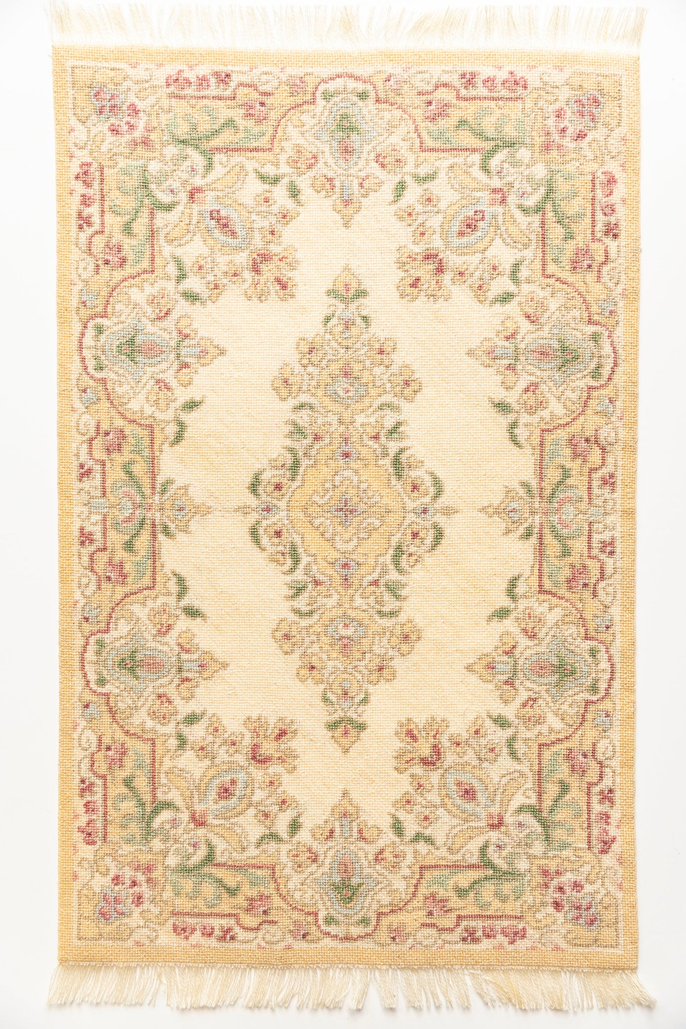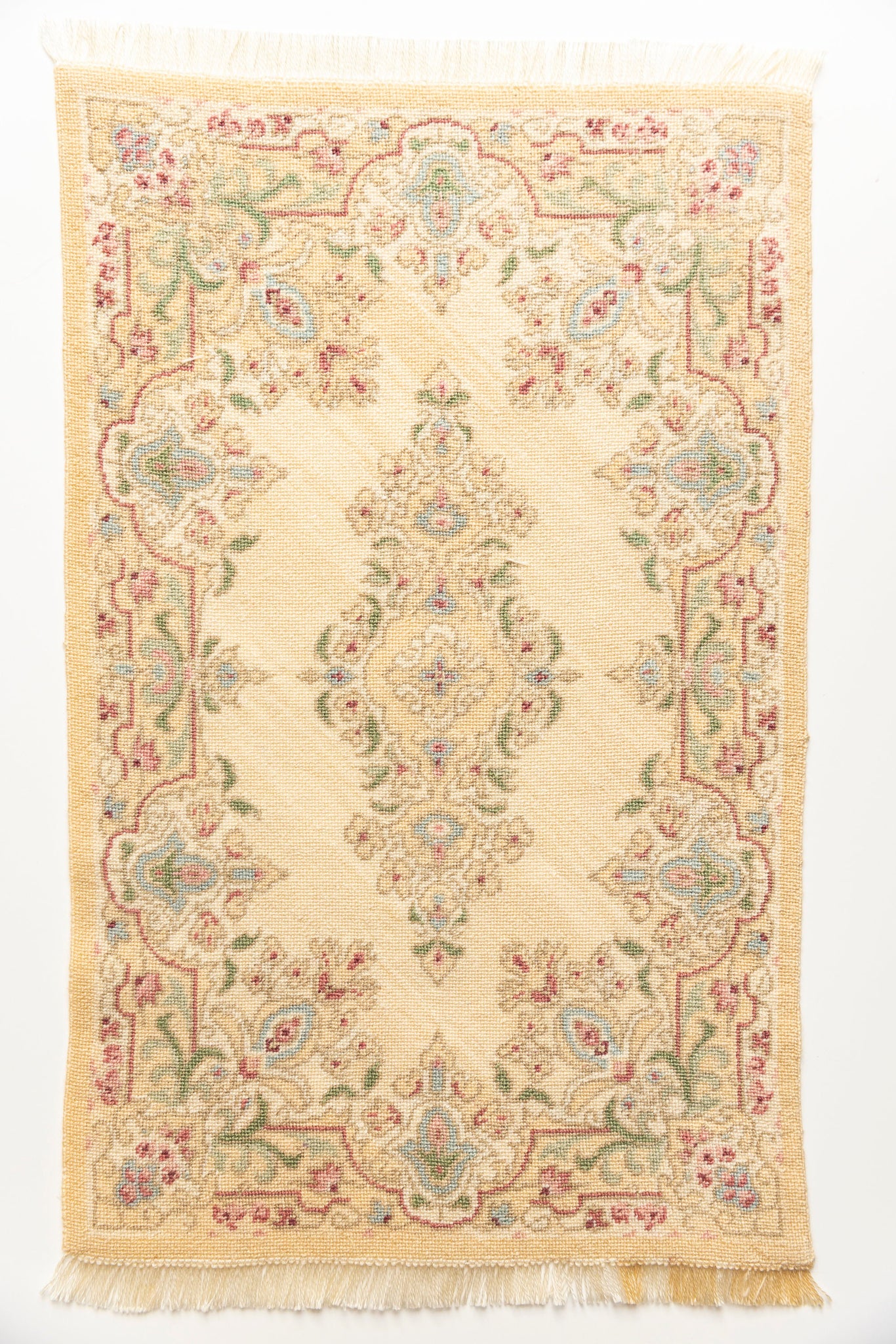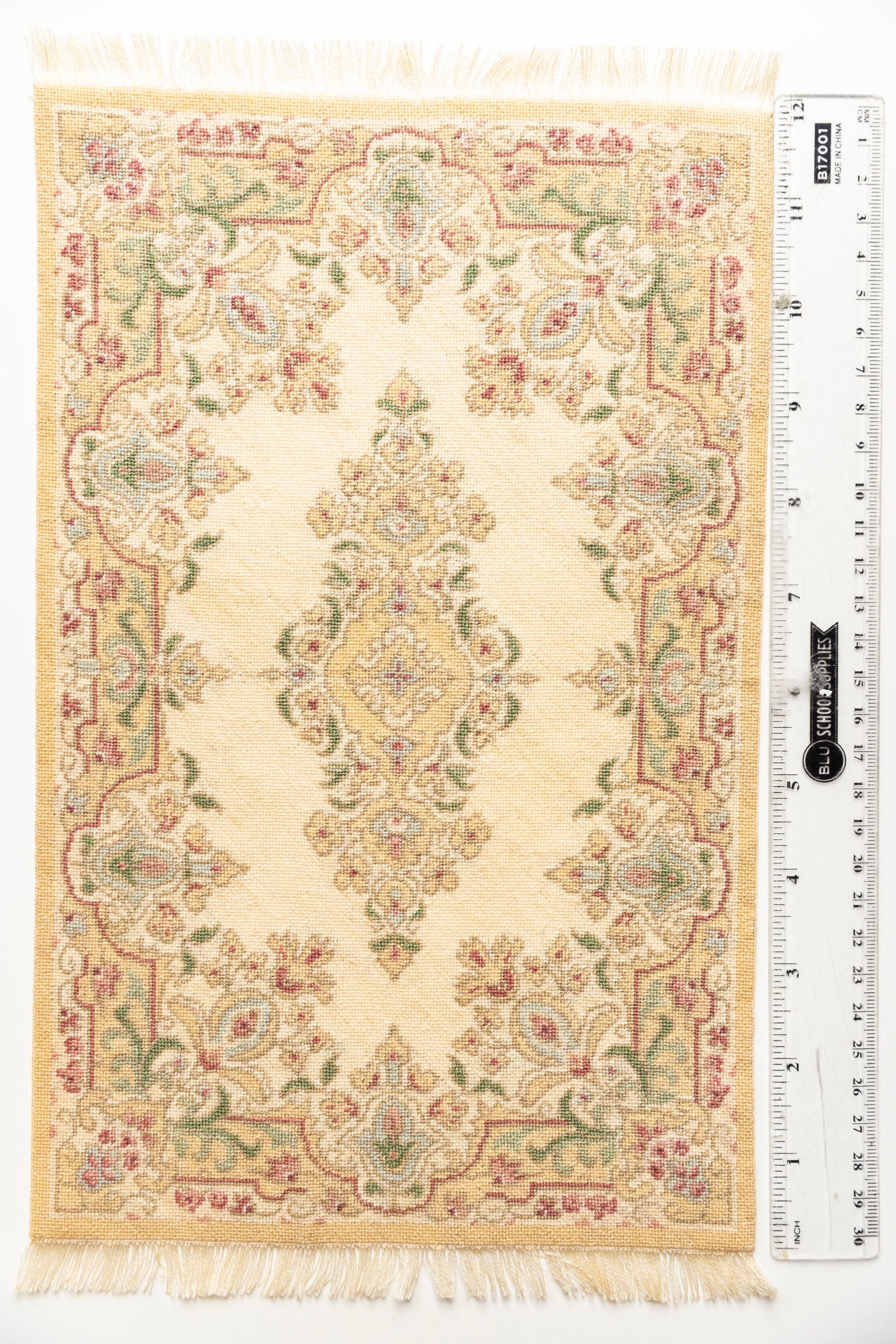 **Dollhouse Miniatures, 1:12 scale** Extra large petit point rug with cream colors, blues, pinks and burgundy. Extra large petit point beautiful work by Ursula Sauerberg. She did needlepoint/petit point every day of her life. Just beautiful. Approximately Measures: 14 1/4" x 9 1/4"
