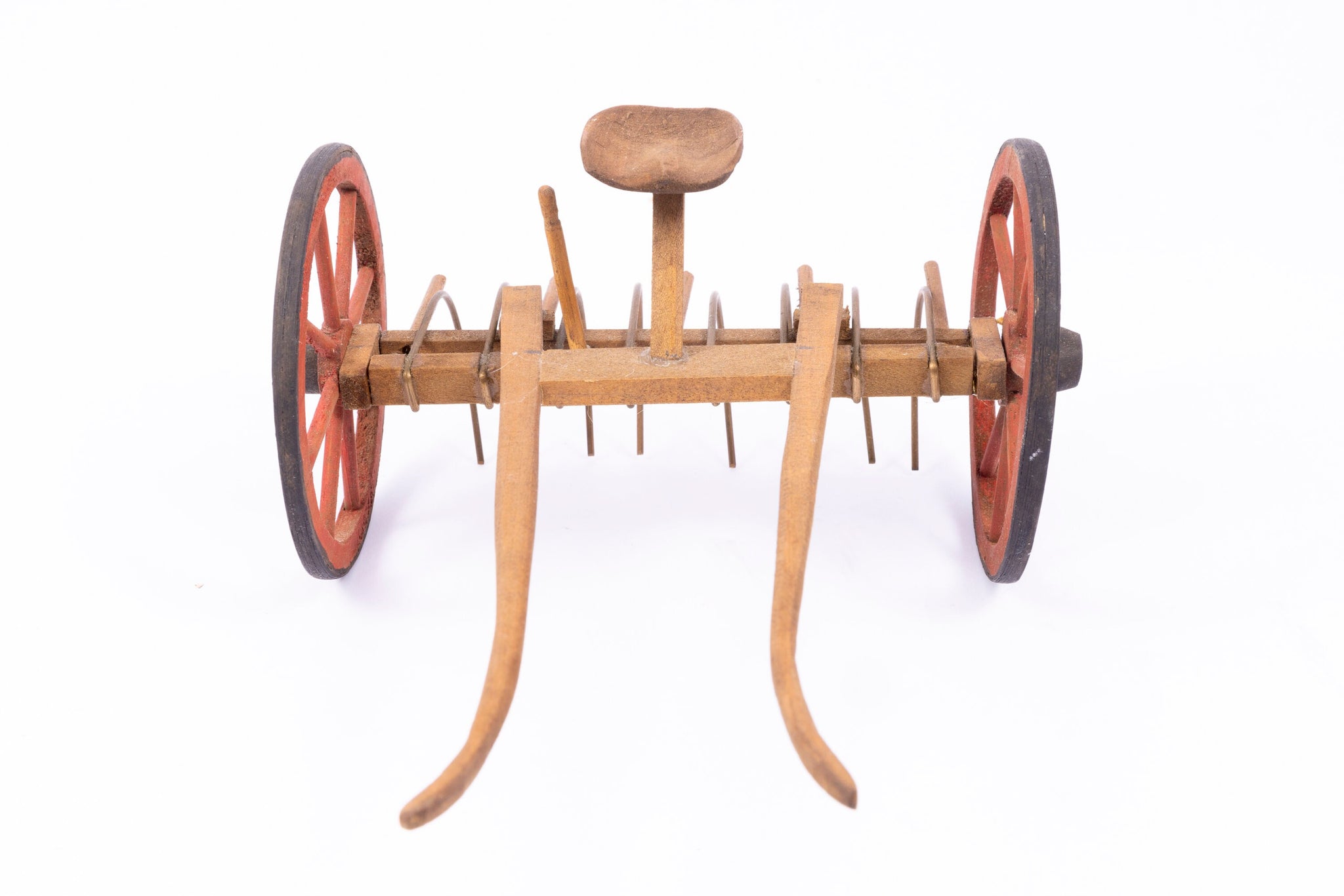 This is a handmade wooden straw rake harrow. Old fashioned, and beautifully made with brass rake portion with wood. The wheels are wooden and it's signed and dated 1995, DFR. Believed to be by Don Rogers.