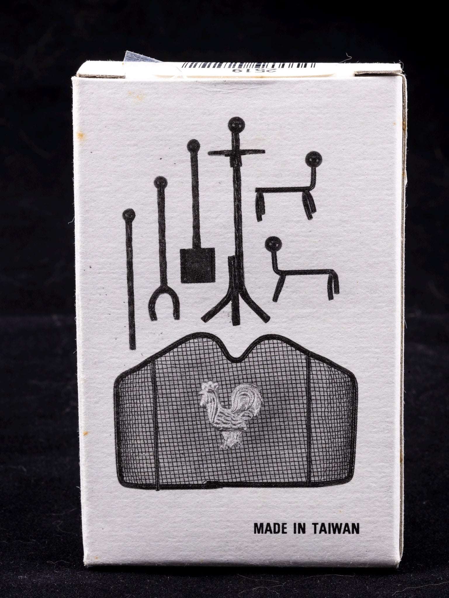 This is a painted metal firescreen and fire place tools. The pieces are painted black with a gold metal rooster in the middle of the firescreen. No longer being made by Concord Miniatures. Vintage.