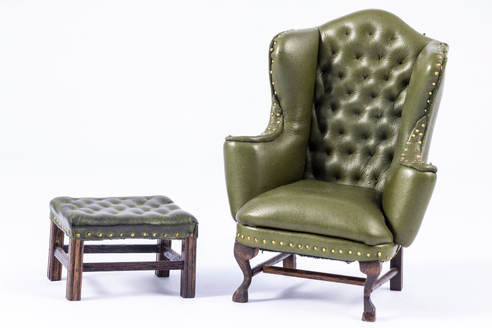 This is a hand made green leather wing back chair and matching ottoman. Beautifully tuffted and great nail heads all around both the chair and matching ottoman. Handmade byJoan Ince, which I belive is from the UK. From the Lee Lefkowitz collection.