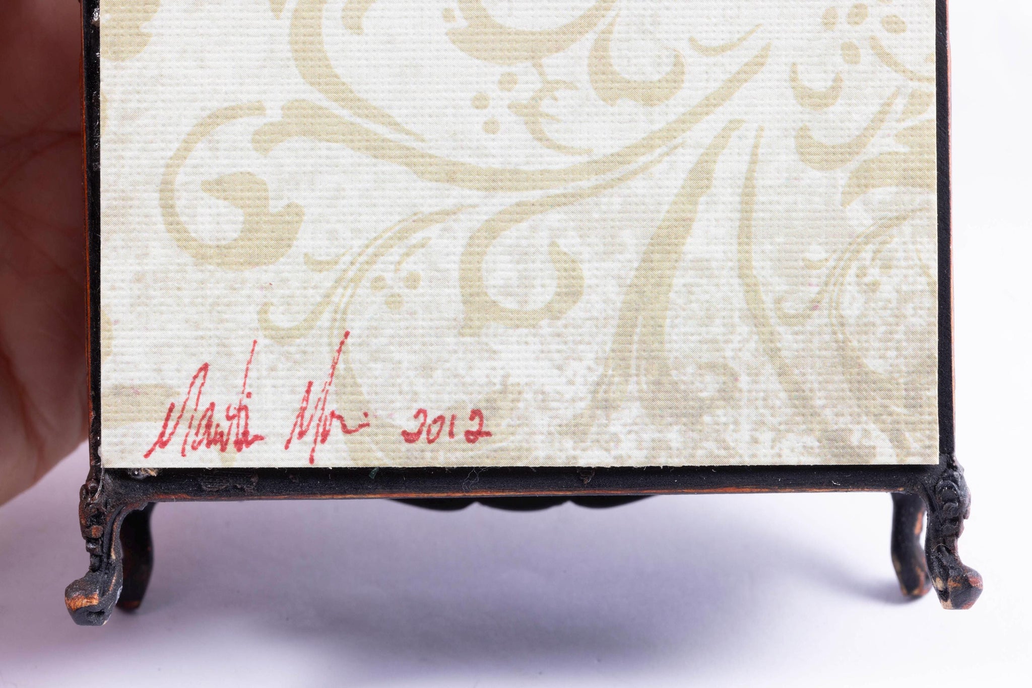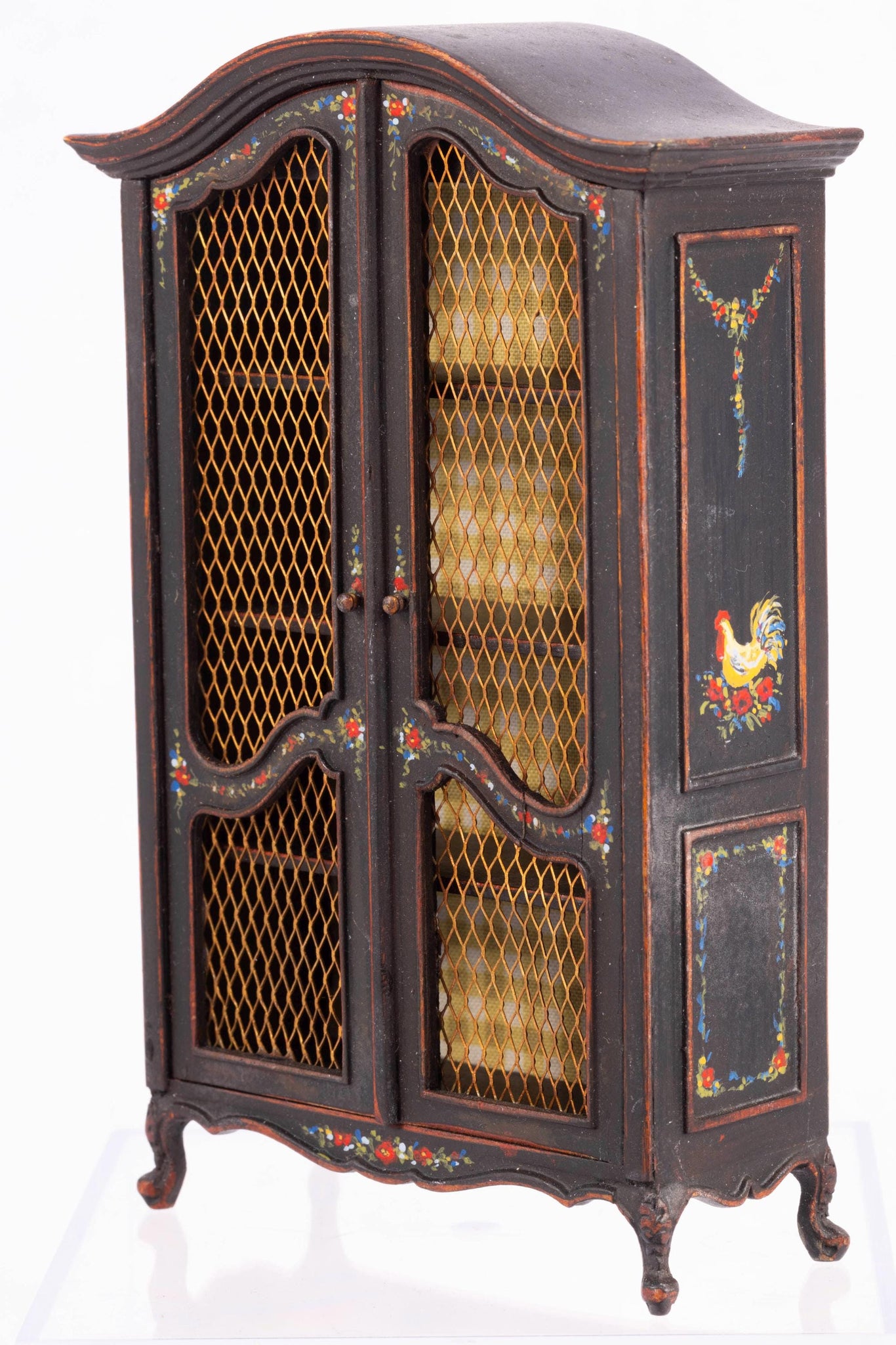 This is a hand painted cabinet with painted roosters and flowers. The screen/chicken wire on the front of the cabinet is well done and unique. The table is painted to match as well as the chairs with a gold colored fabric with roosters on top.
