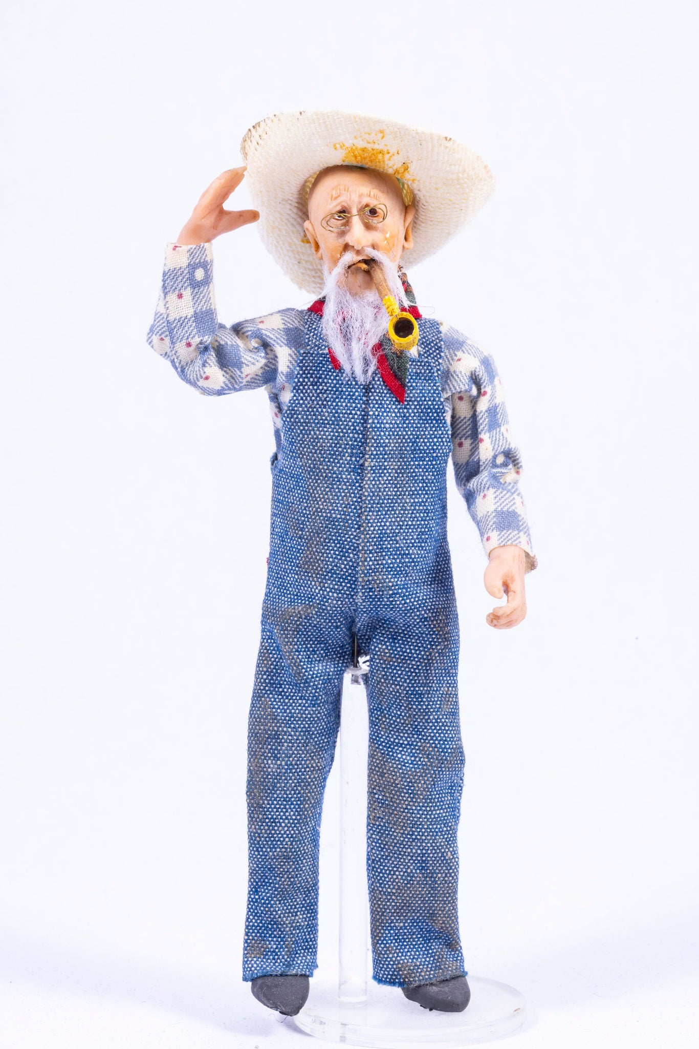 This is a hand made sculpted doll dressed as a farmer. He's just terrific. He's wearing a pair of jeans overalls, has a hat and corn cob pipe.