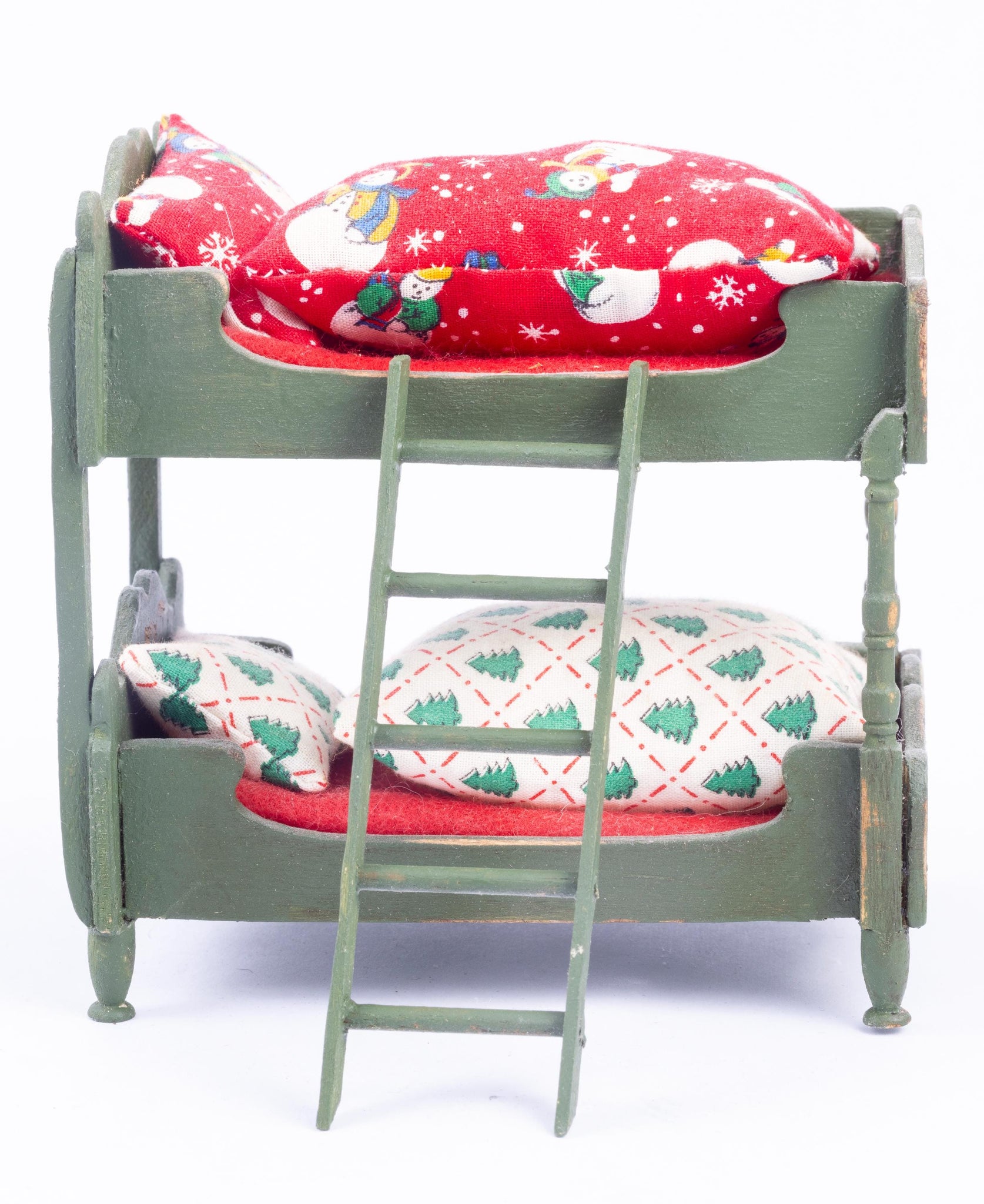 This is a wonderful hand painted bunk bed for an elf or a child. The bed is hand painted green with red bedding with snowmen and white bedding with green Christmas trees. Ladder included. Pillows as well. Ursula Sauerberg estate.