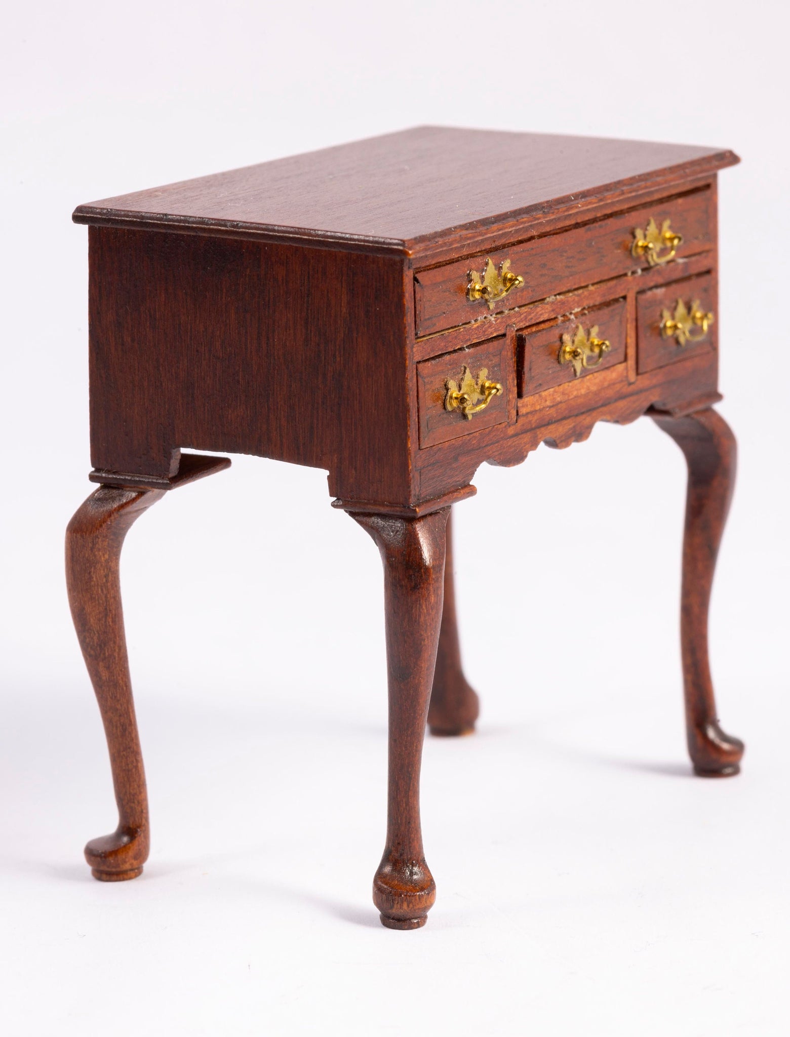 This is a wooden hand made five drawer chest by Stan Gould. The table appears to be mahogany and the drawers open and close nicely.
