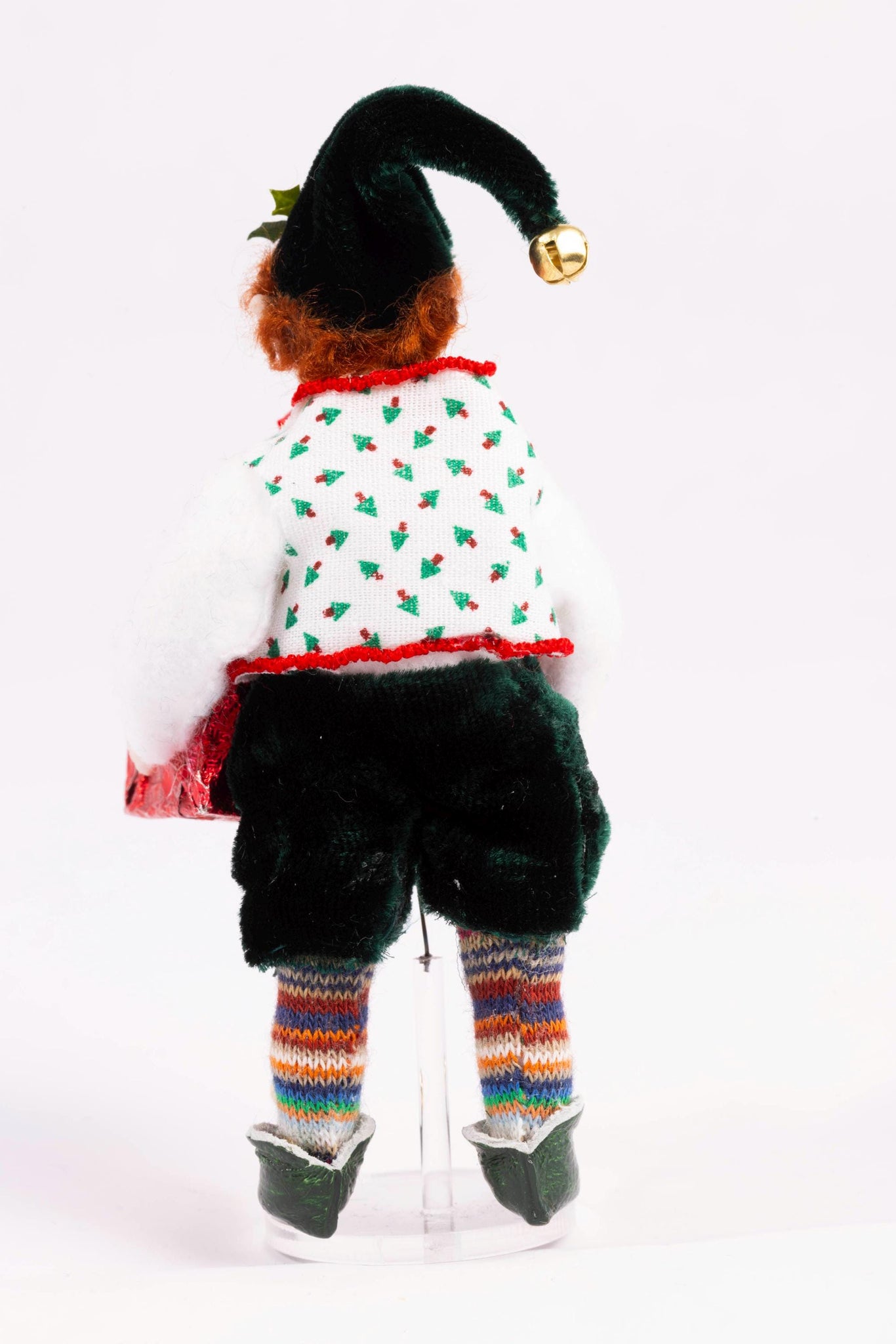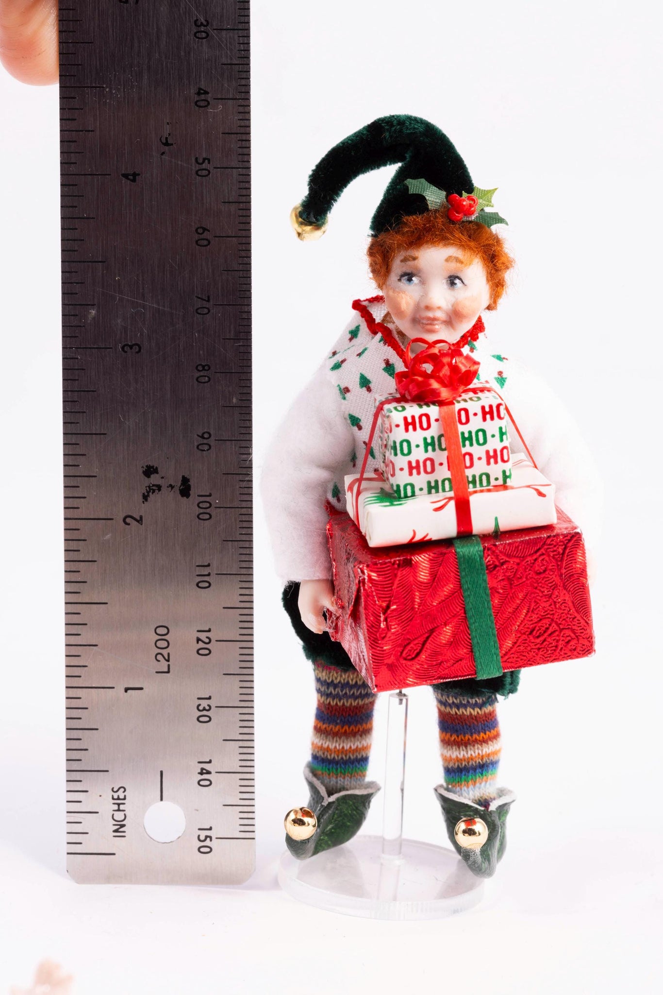 This is a hand made porcelain elf doll by Fern Vasi. He's holding a stack of Christmas presents. Beautifully dressed with elf shoes.