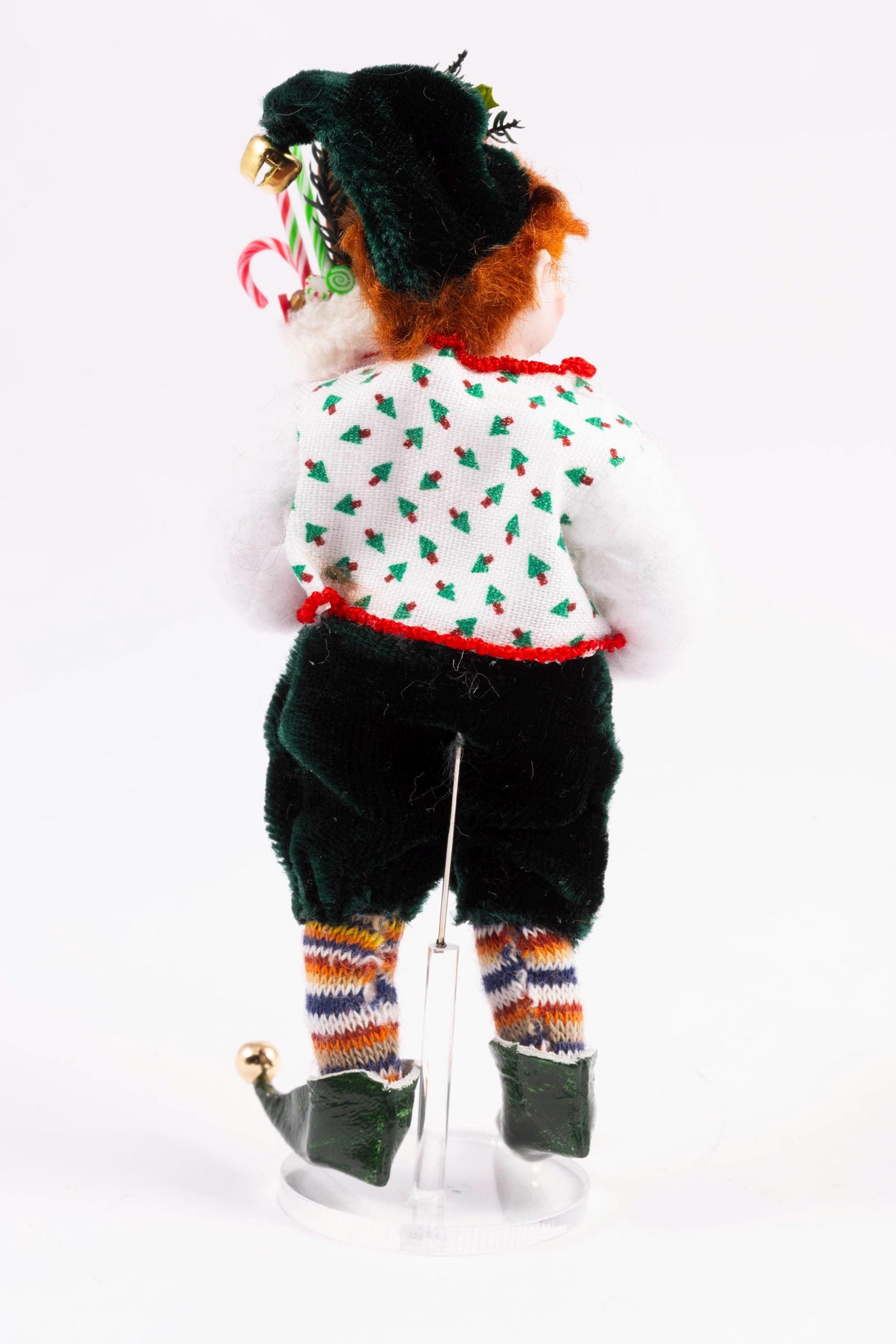 This is a hand made porcelain elf doll by Fern Vasi. He's holding a filled stuffed Christmas stocking. Beautifully dressed with elf shoes.