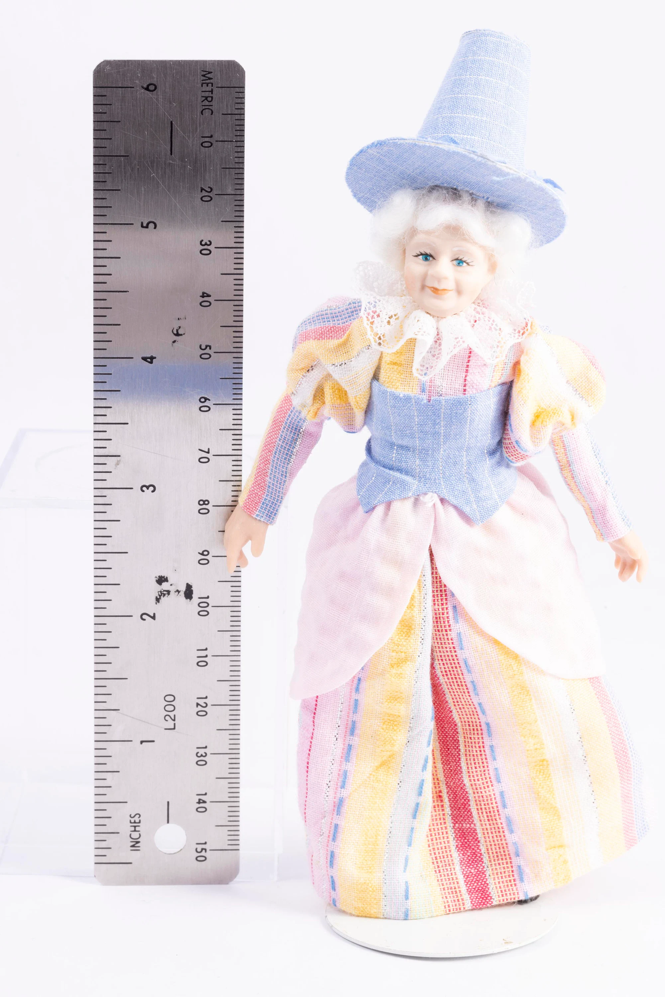 This is a hand made porcelain Mother Goose Doll. She's made of porcelain and hand painted. She is wearing a pretty striped dress and blue hat.