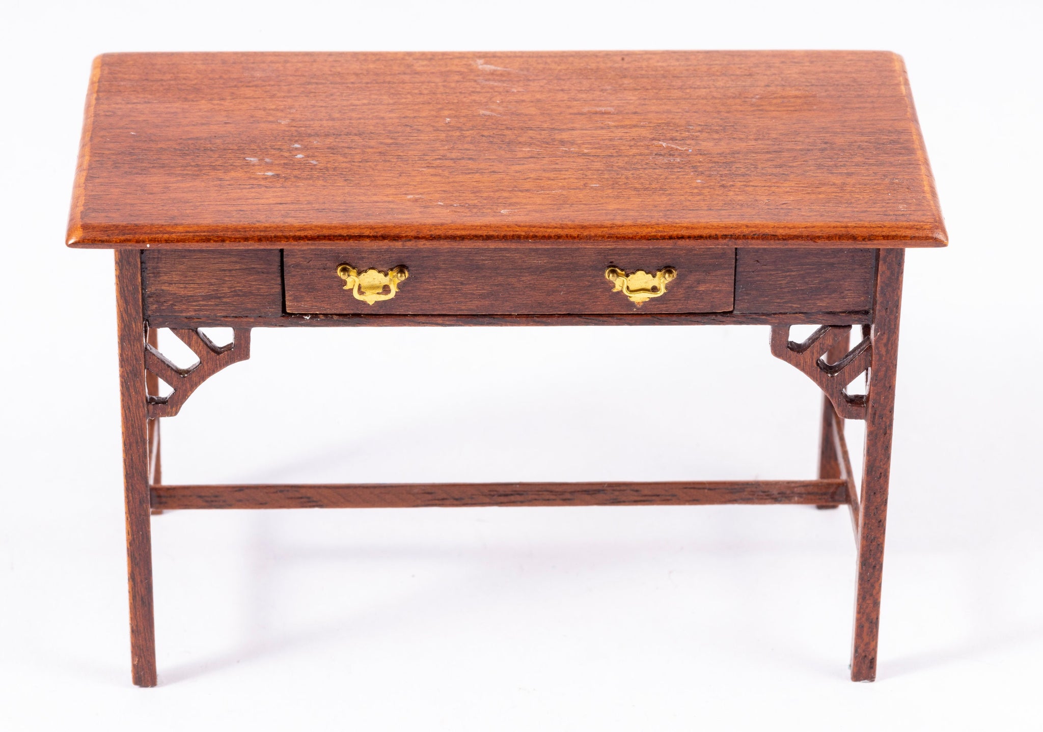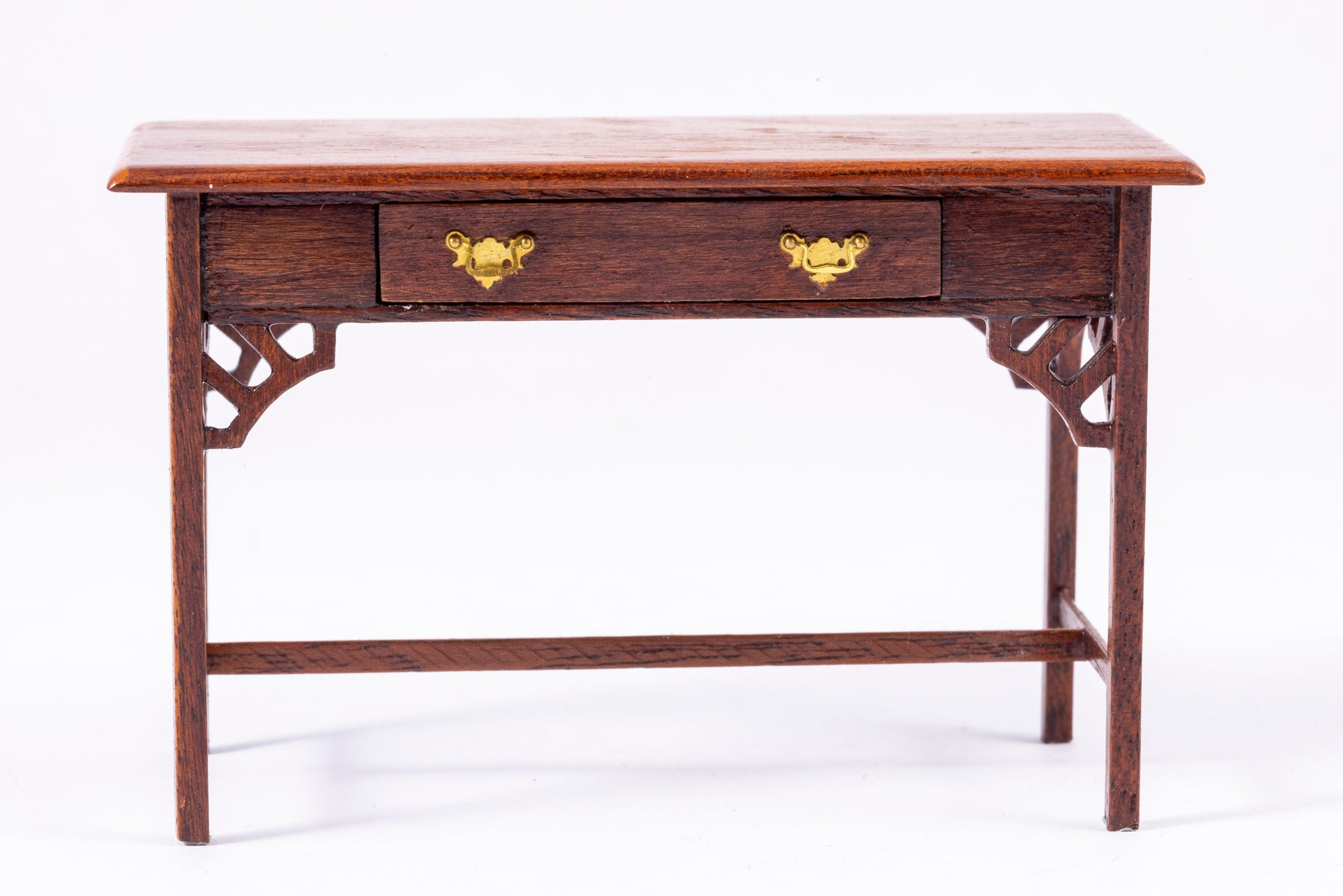This is a hand made wooden side table by Small Ideas. Nicely carved detail and working drawer with brass handles. From the Lee Lefkowitz collection.