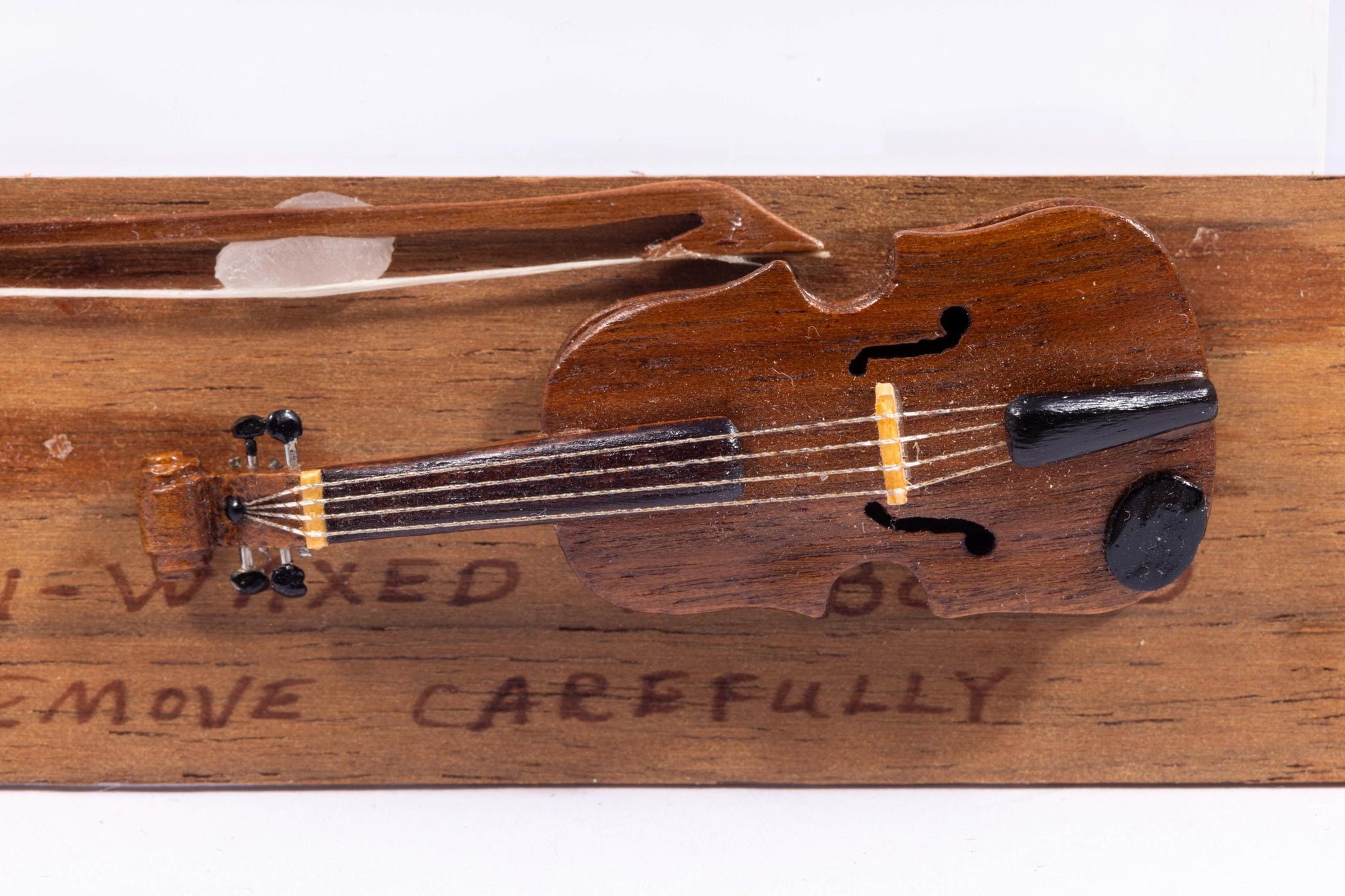 This is a wonderful handmade violin and bow. The back is signed CMS, and was made in 1983. The bow and violion are entirely handmade. The violin and bow are only waxed to the wooden display for safety and are easily removed.