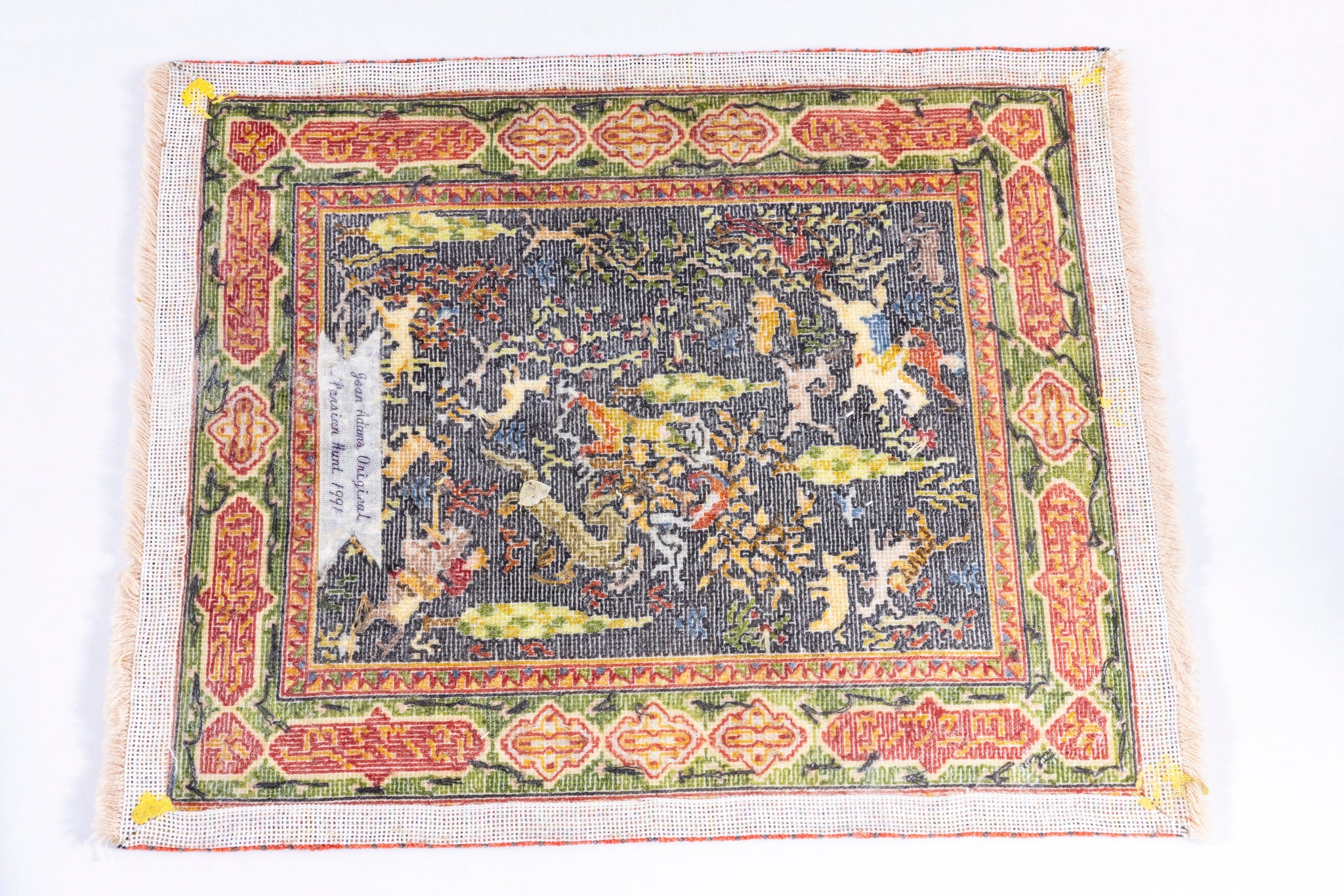 This is a hand made original rug by Joan Adams. The Persian Hunt, from 1991. Beautifully made wool rug. From the Lee Lefkowitz collection.