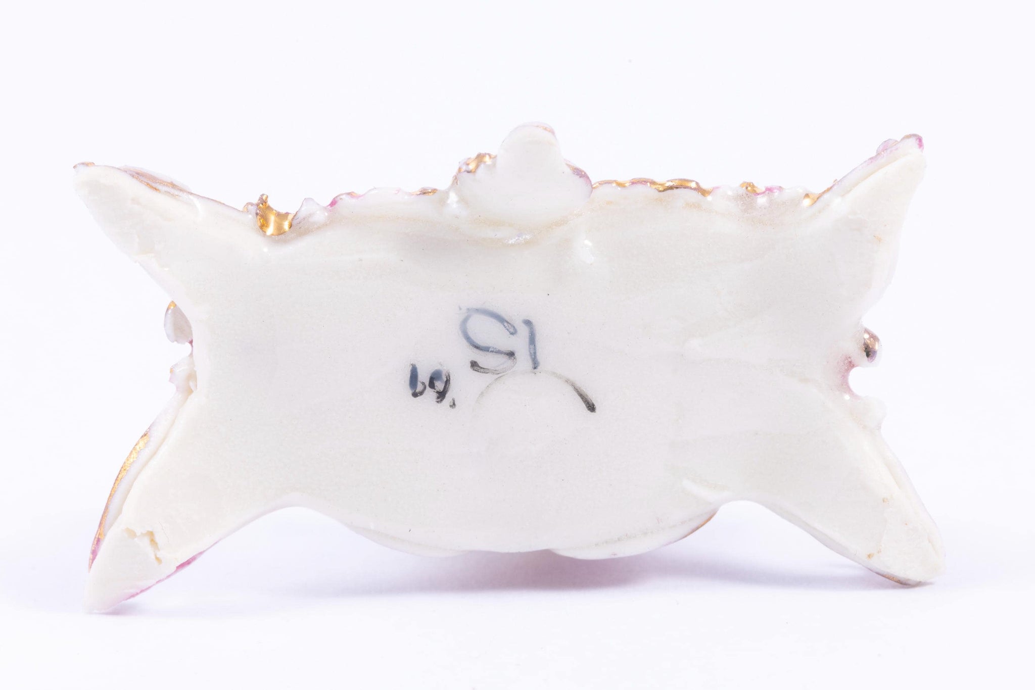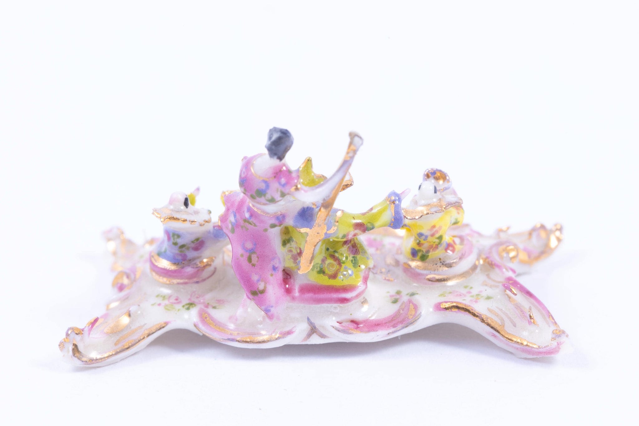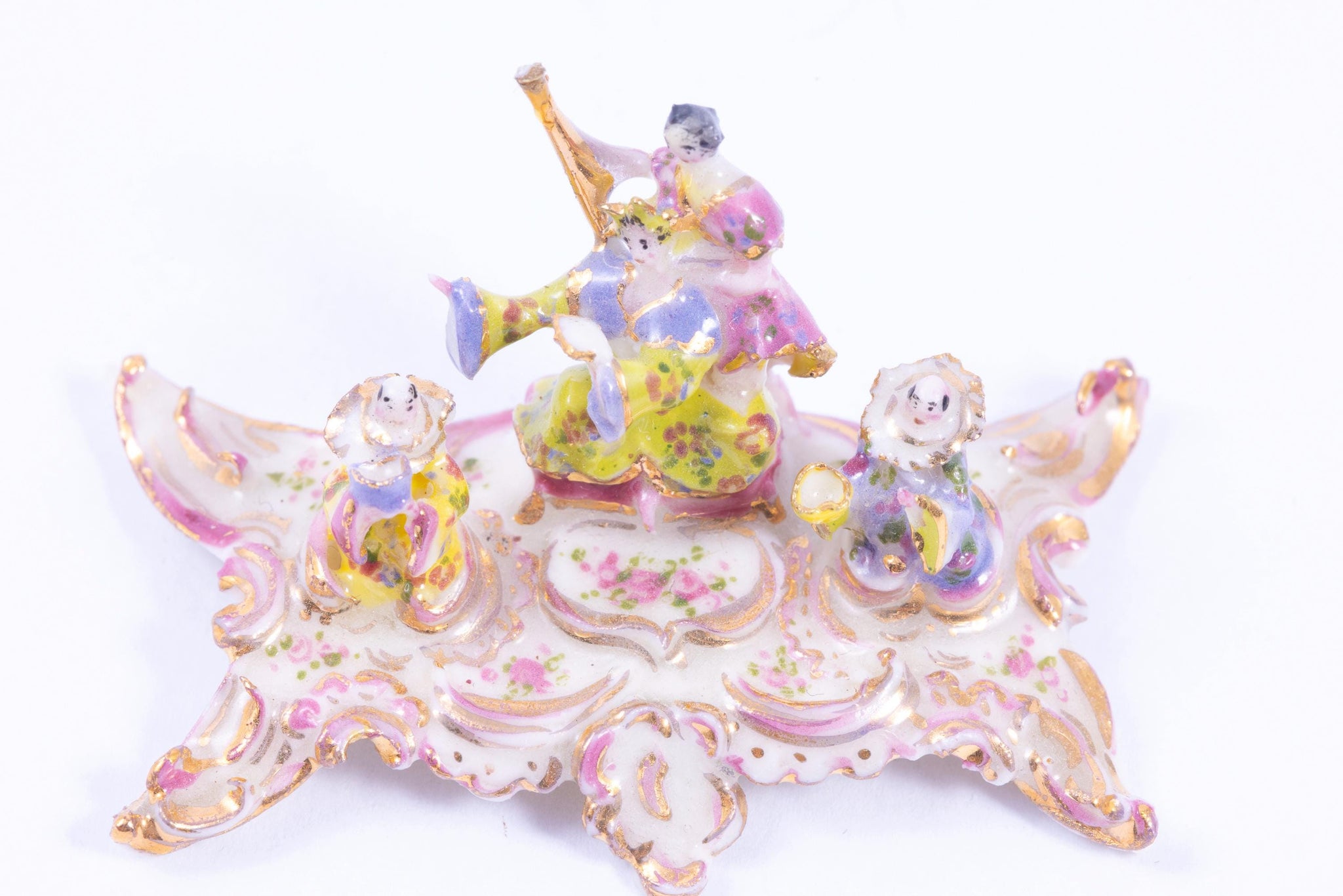This is a beautiful hand made porcelain Tricia Street piece. It's an Inkwell. There's a lady in the middle with another next to her with two people on either side. I've discounted this because there's a small chip on the curl of the back left end. From the estate of Ursula Sauerberg.