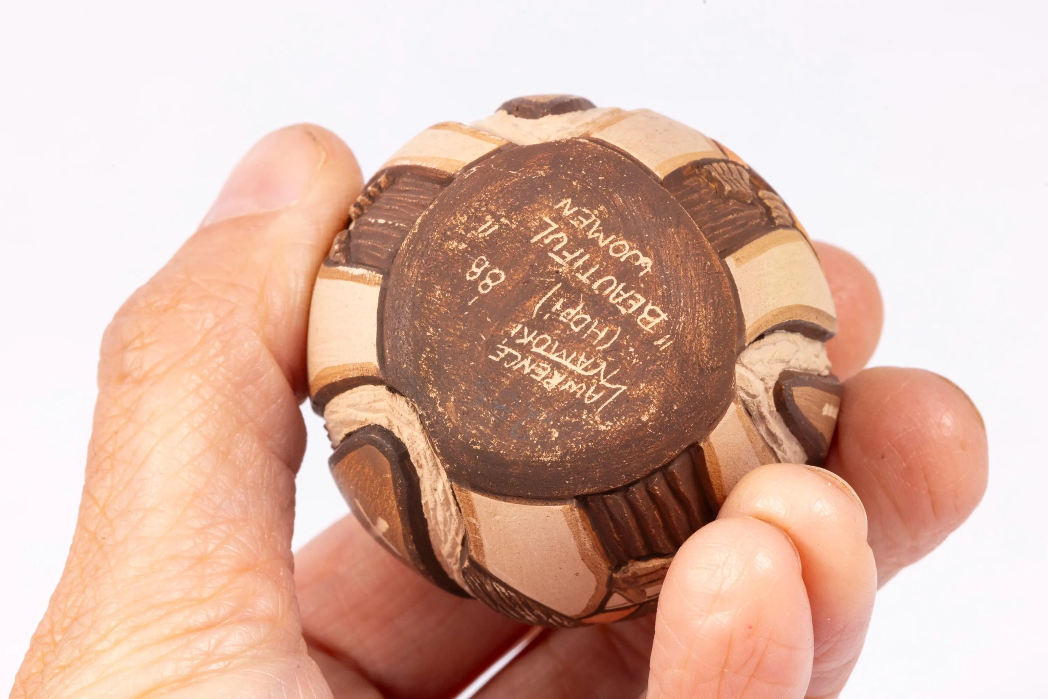 This is a hand carved beautiful Native American piece. It's decorative with a hole up top. The work was done by Lawrence Namoki. A terrific piece from KBM estate.