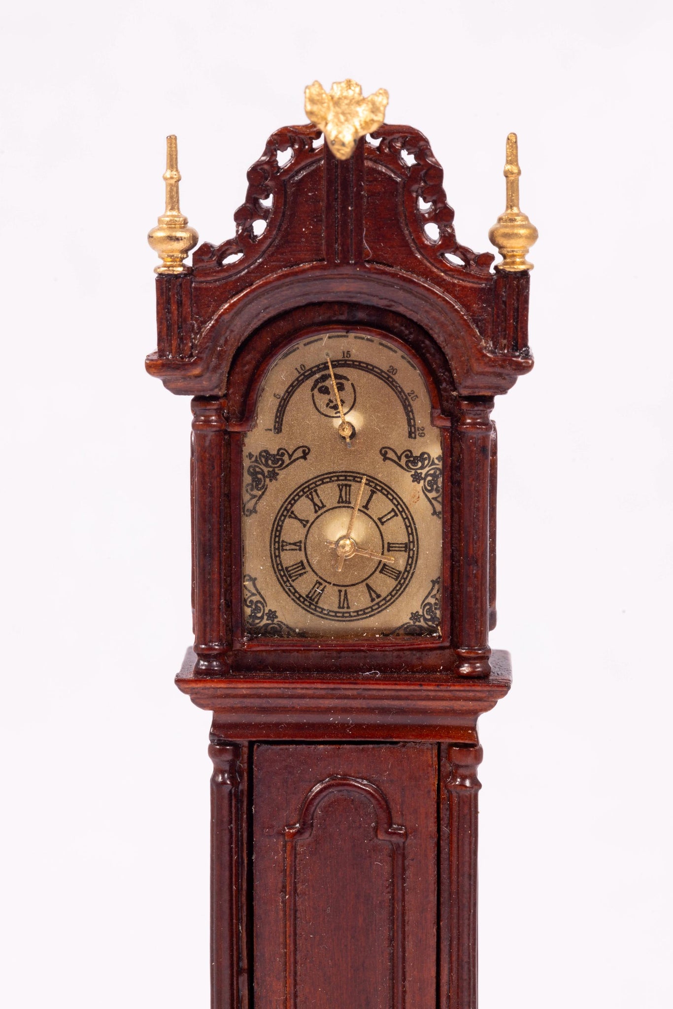 This is a Bespaq mahogany grandfather clock. There's painted gold features on the top finials and bird in the center. Brass face.