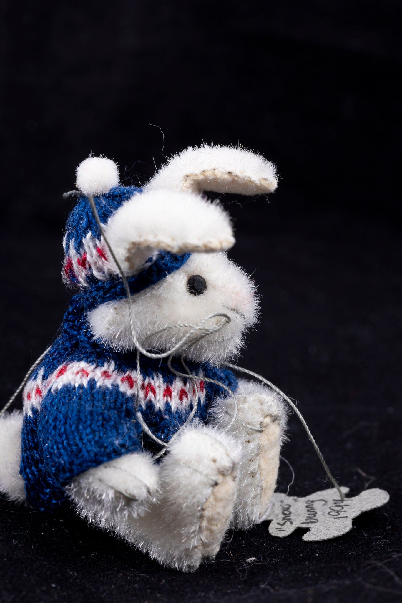This is a hand made fluffy bunny rabbit toy by Mary Bures. Well made and lovely, movable. Gorgeous handmade sweater and matching hat. Made in 1994, original tag still attached. This bunny is named "Snow Bunny". From the estate of Tricia Smith.