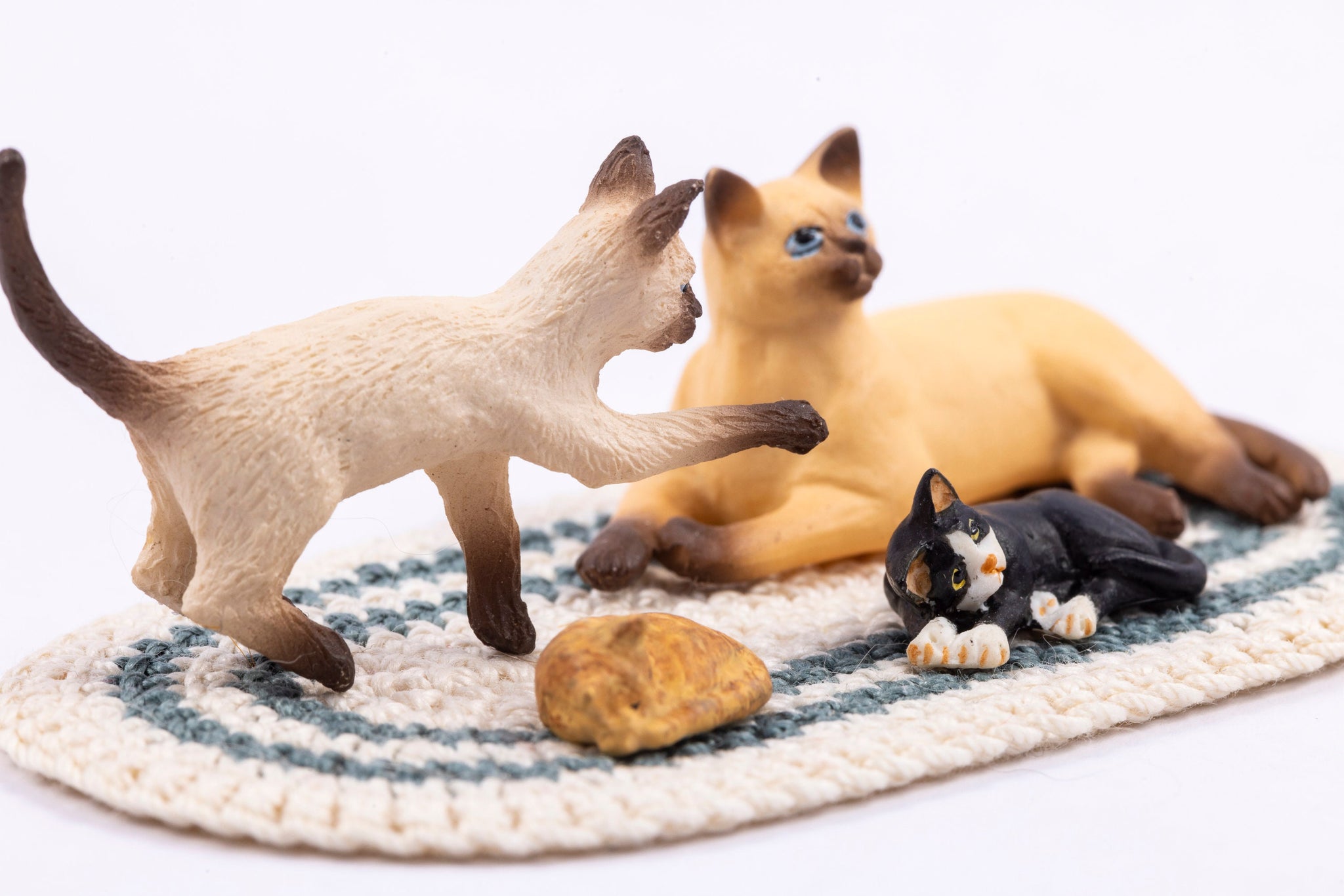This is a terrific group of kittens and cats. They are on a hand crocheted oval rug that's ecru and green. Cats made of resin from Falcon. From the Kraft collection.