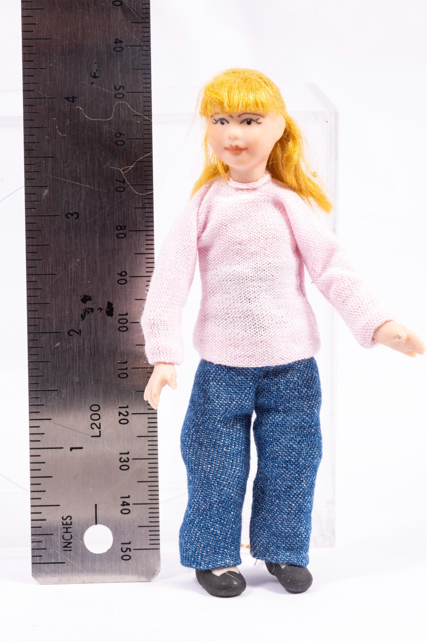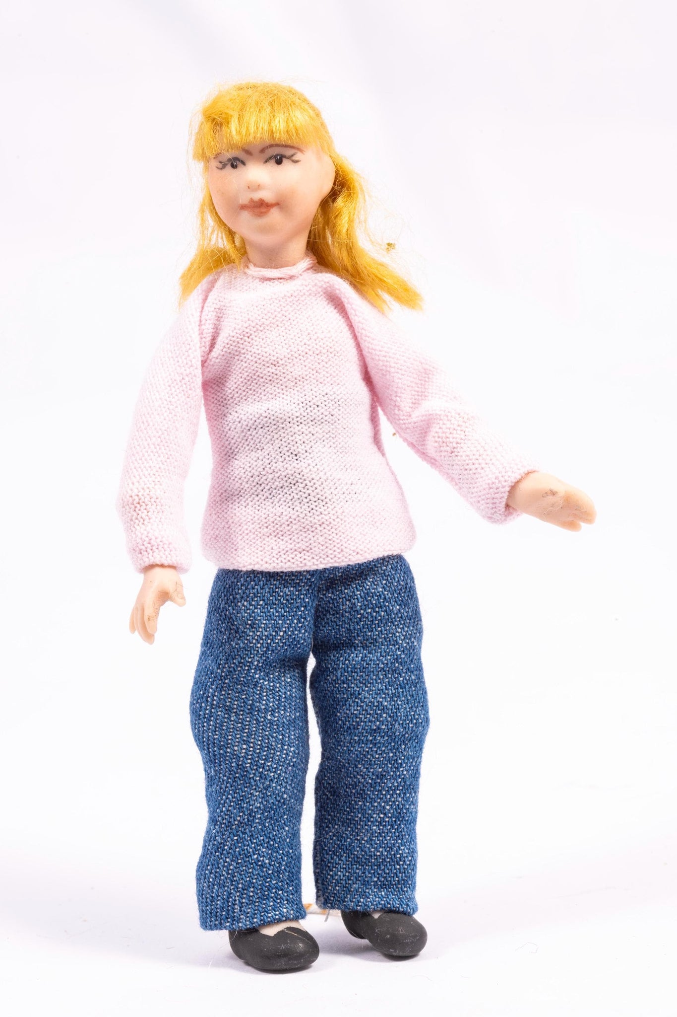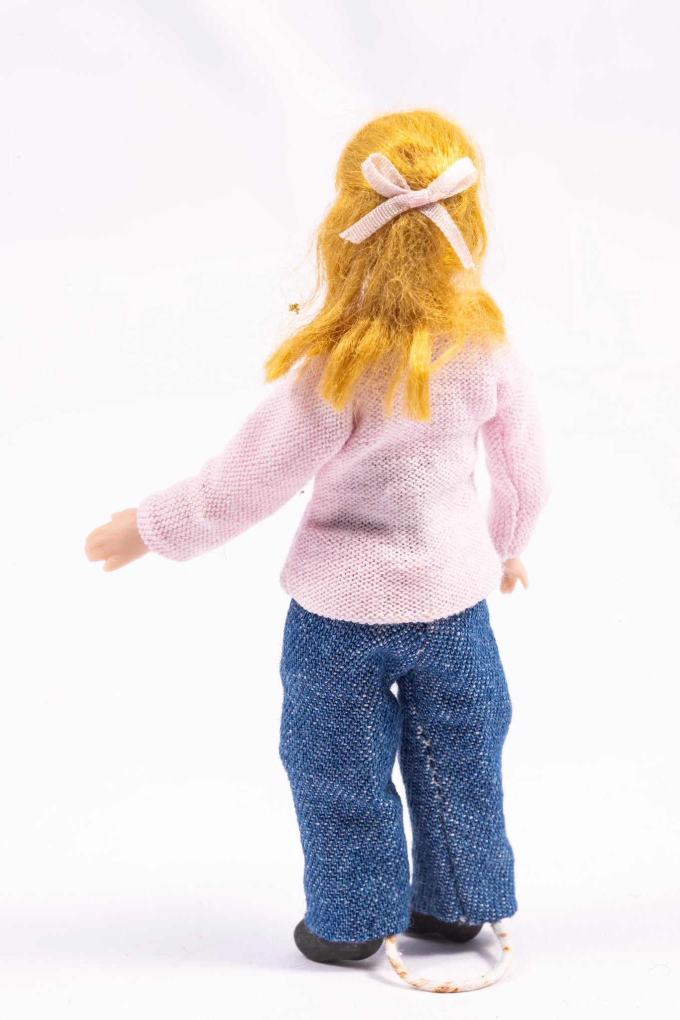 This is an artisan made doll by Cindy Cook. This doll is a little girl wearing a pink sweater and blue jeans. She is also wearing a pink bow in her blonde hair.