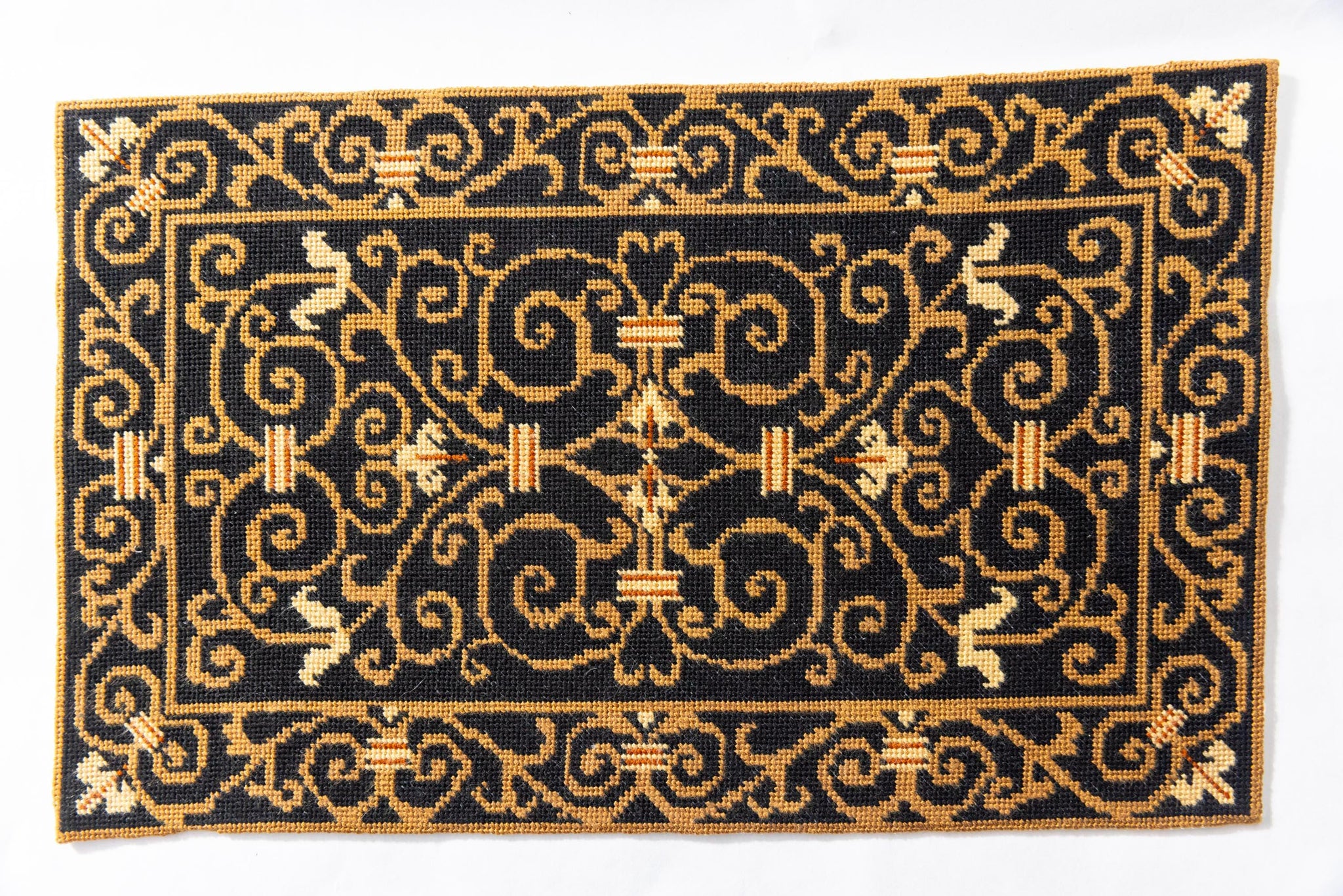 This is a beautiful handmade rug from a Janet Patacca, Stitches in Miniature kit. Well done, Scrolls with black, rust and gold colors.