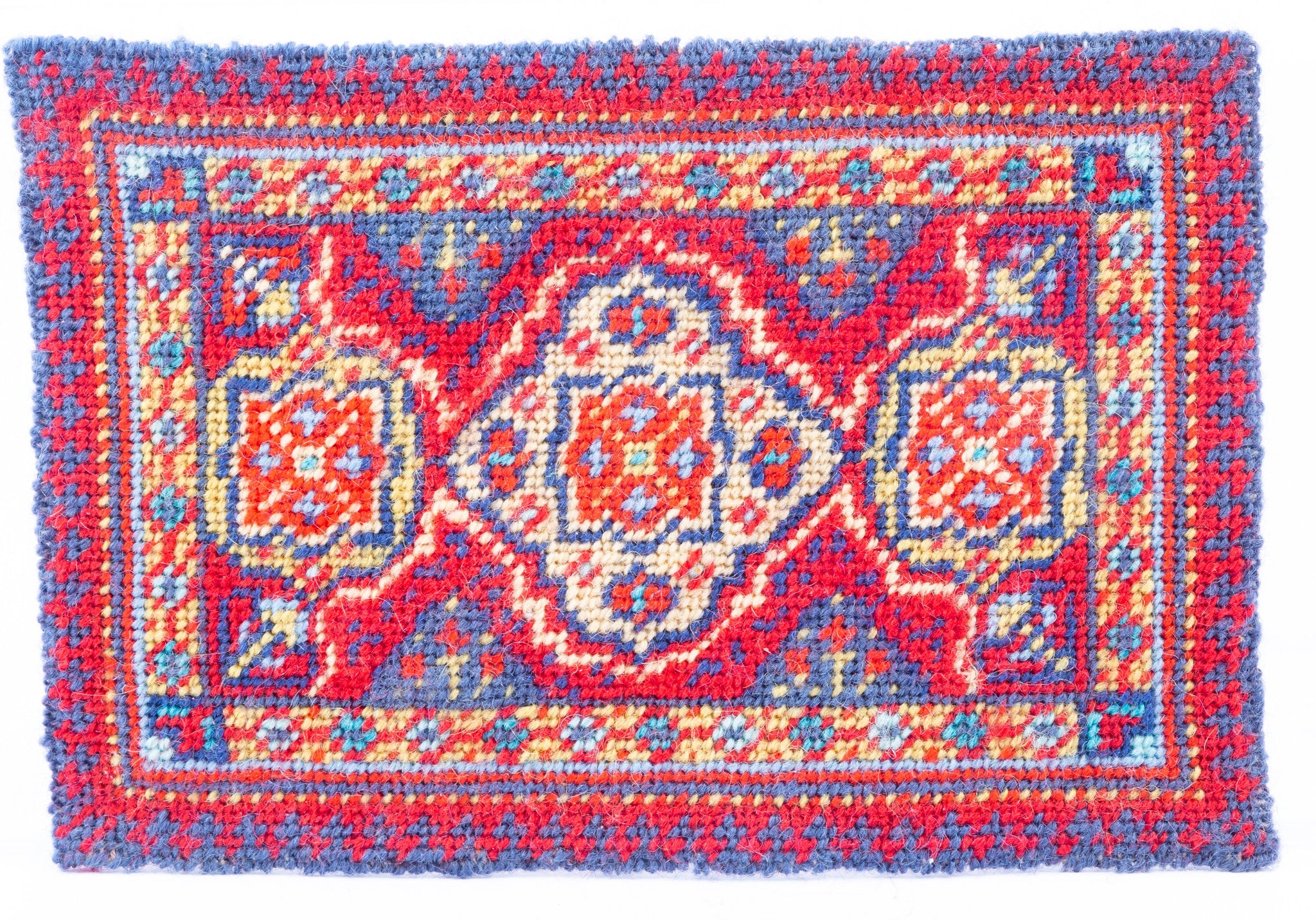 This is a needlepoint rug with blues and reds. Well made and nicely done.