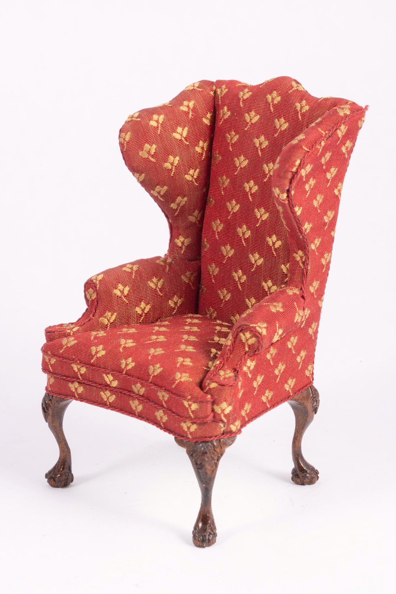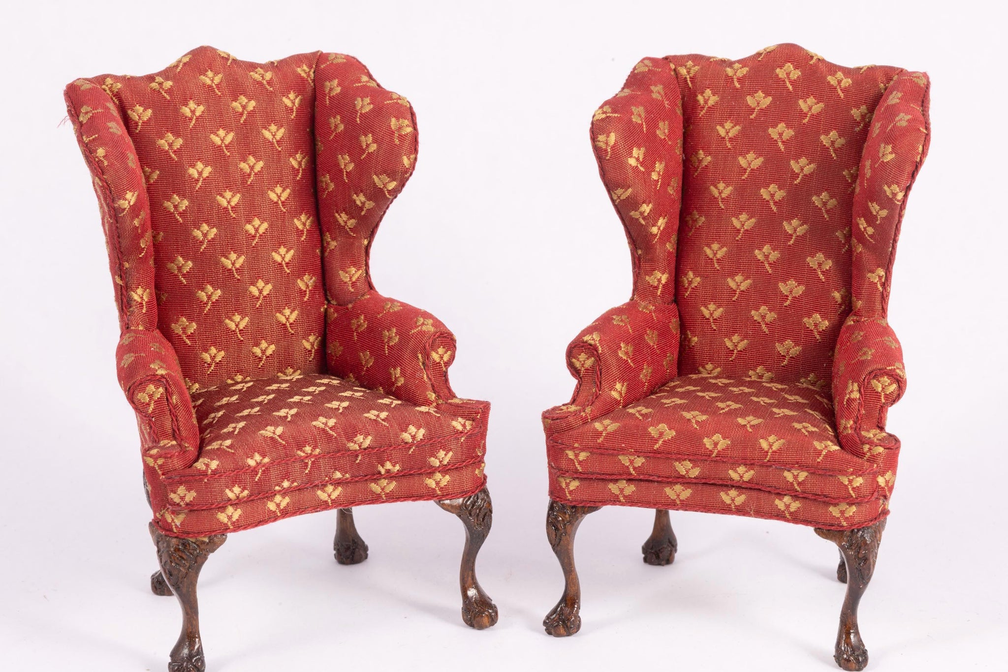 This is a upholstered pair of wing back chairs by Nancy Summers. A beautiful pair with a red background and gold flowers. From the Lee Lefkowitz collection.
