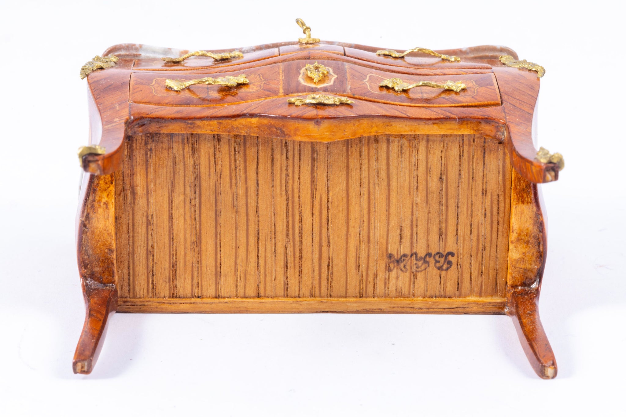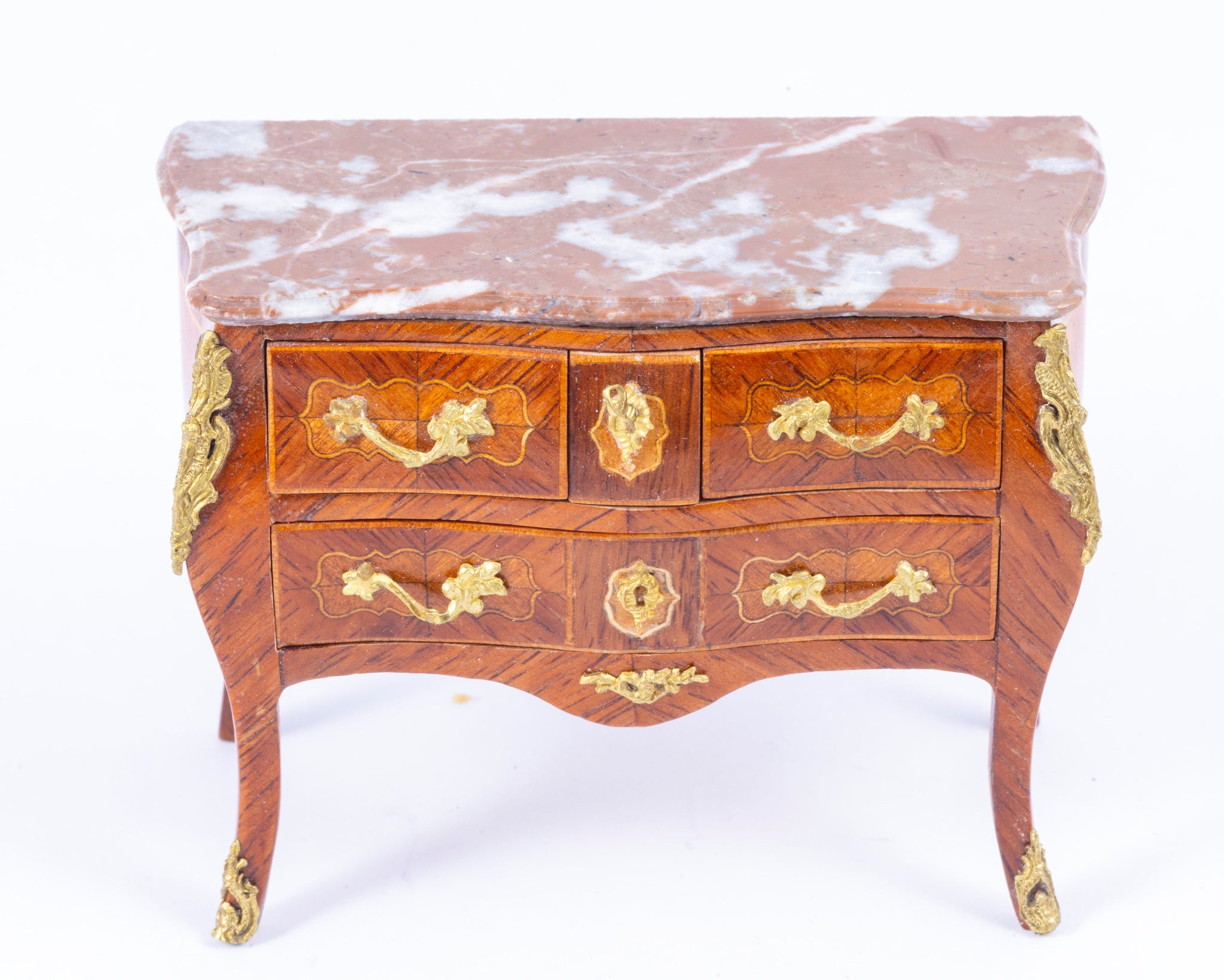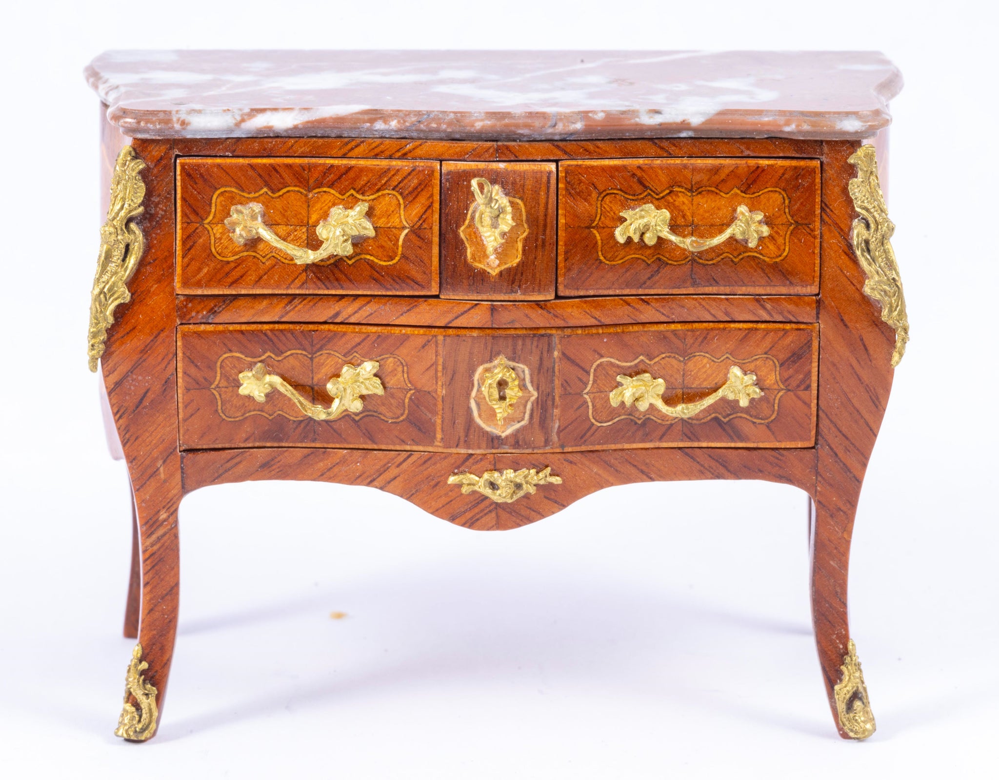 Patricia Herbillon French style commode, marble top over bombe case with cast metal trim. Matching sides and drawer fronts with contrasting shades of mahogany inlay.