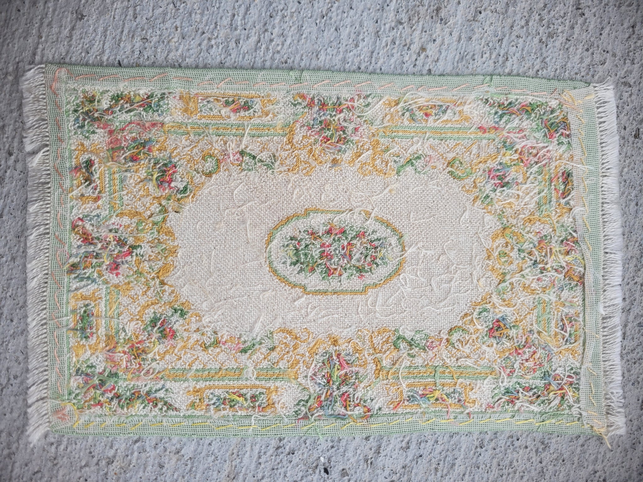 This is a Petit Point Classic Vintage Faded Green and Floral Medallion Center Rug