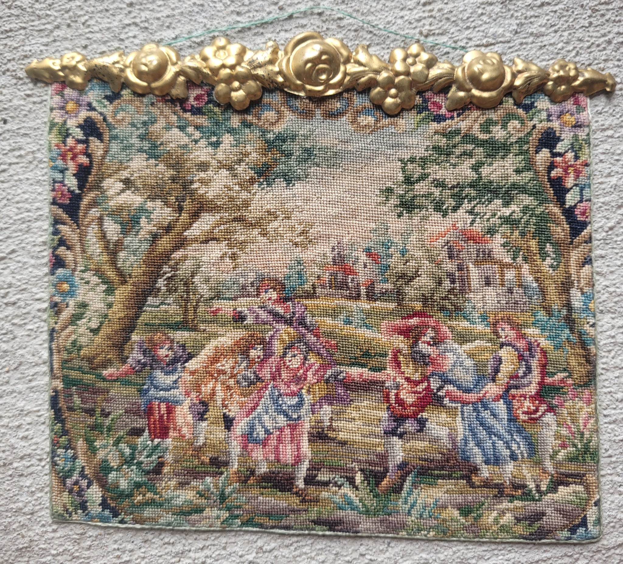 This is a Petit Point Hanging Tapestry Rural Medieval Scene