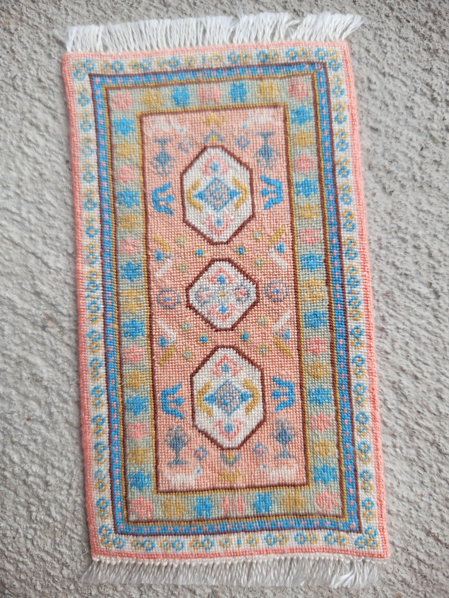 This is a Petit Point Pastel Pink and Blue Hieroglyphic-Style Rug