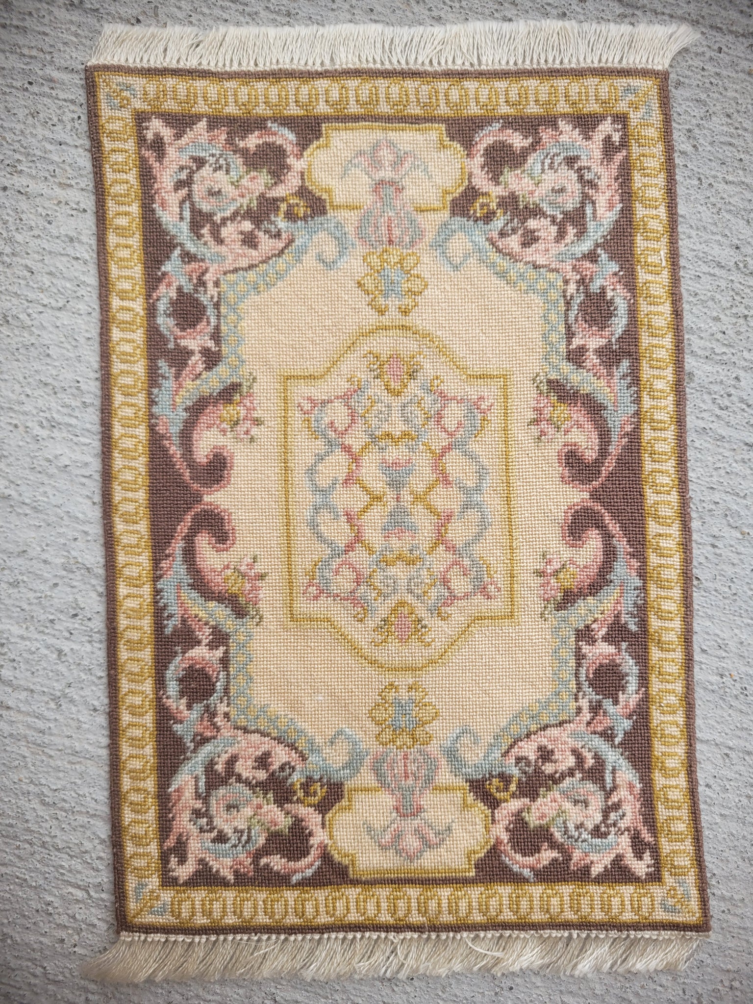 This is a Petit Point Rich Brown Rococo-Style Rug with Scrollwork Border