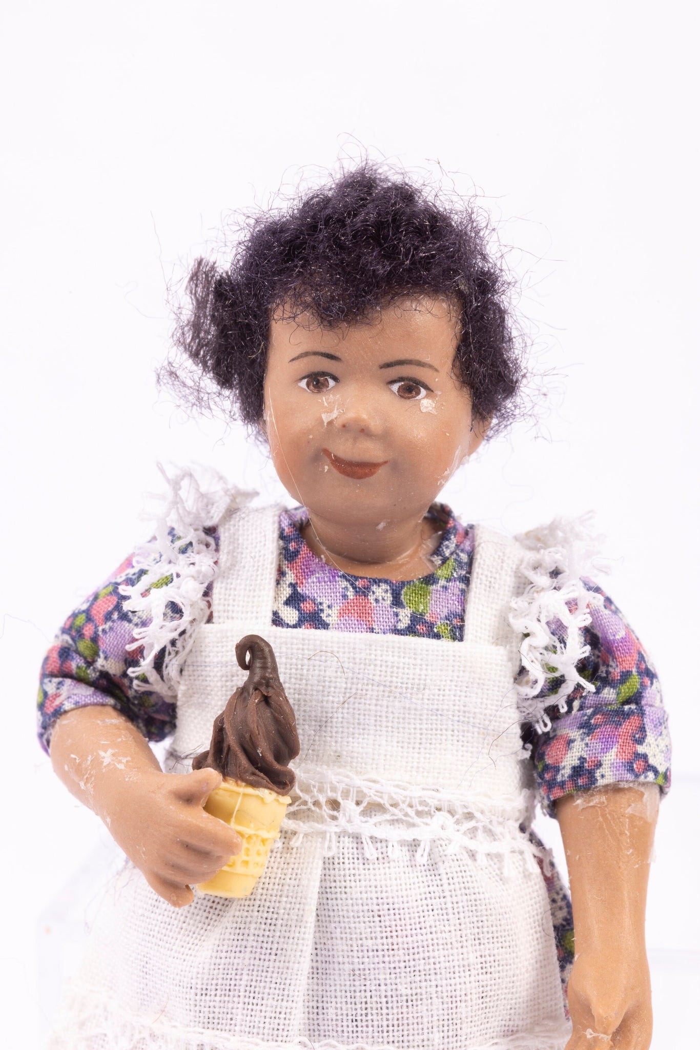 This is a terrific hand made Porcelain Ethnic Young Girl Doll in Floral Dress with white Apron. She's holding an ice cream cone, not included.