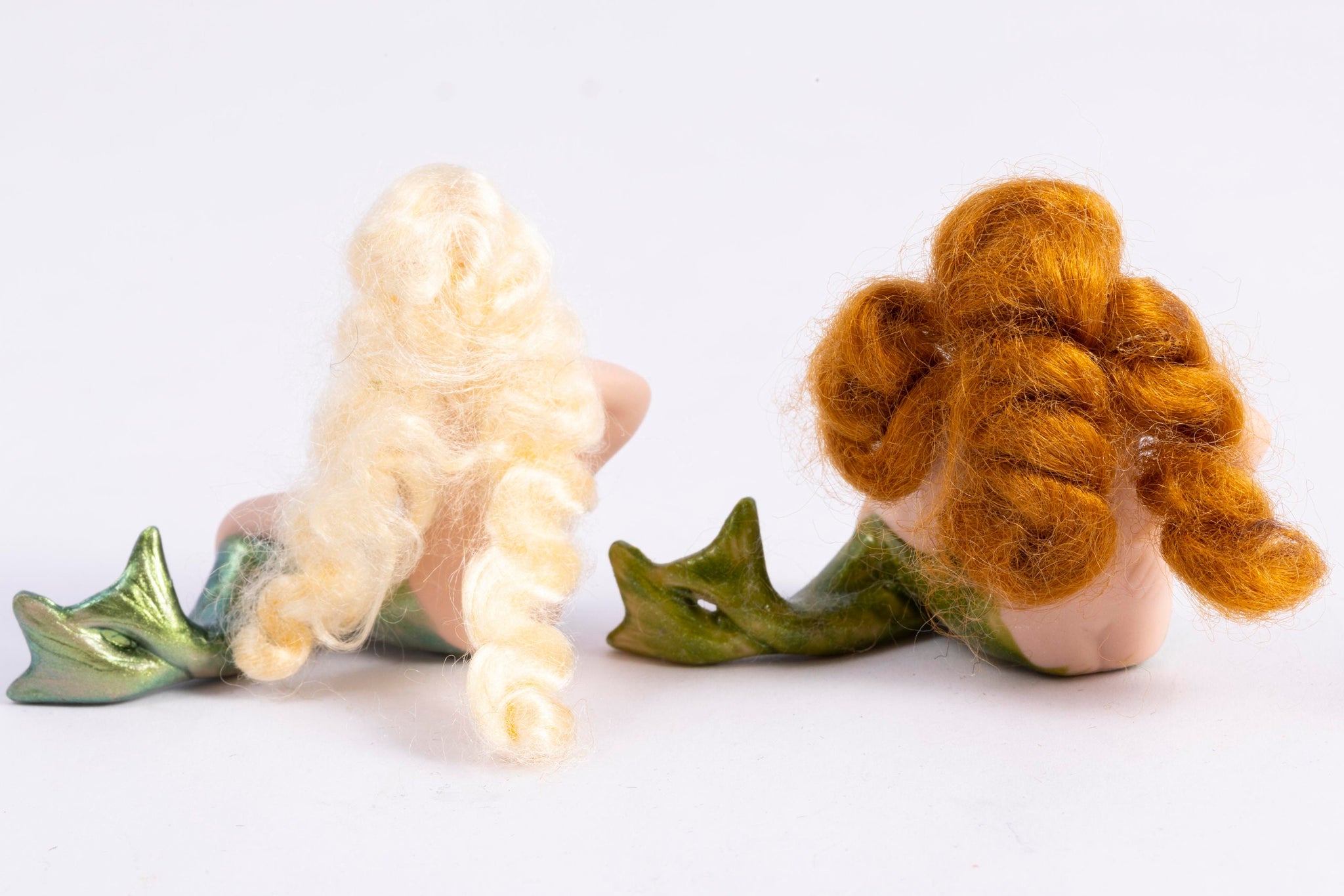 This is a hand made porcelain mermaid doll. One mermaid has blonde hair, the other has red hair. They are smaller, they look like they are young compared to the other mermaids that we have listed. They may possibly work for half scale as we know they are mythical creatures, so the size may vary. Please note the size.