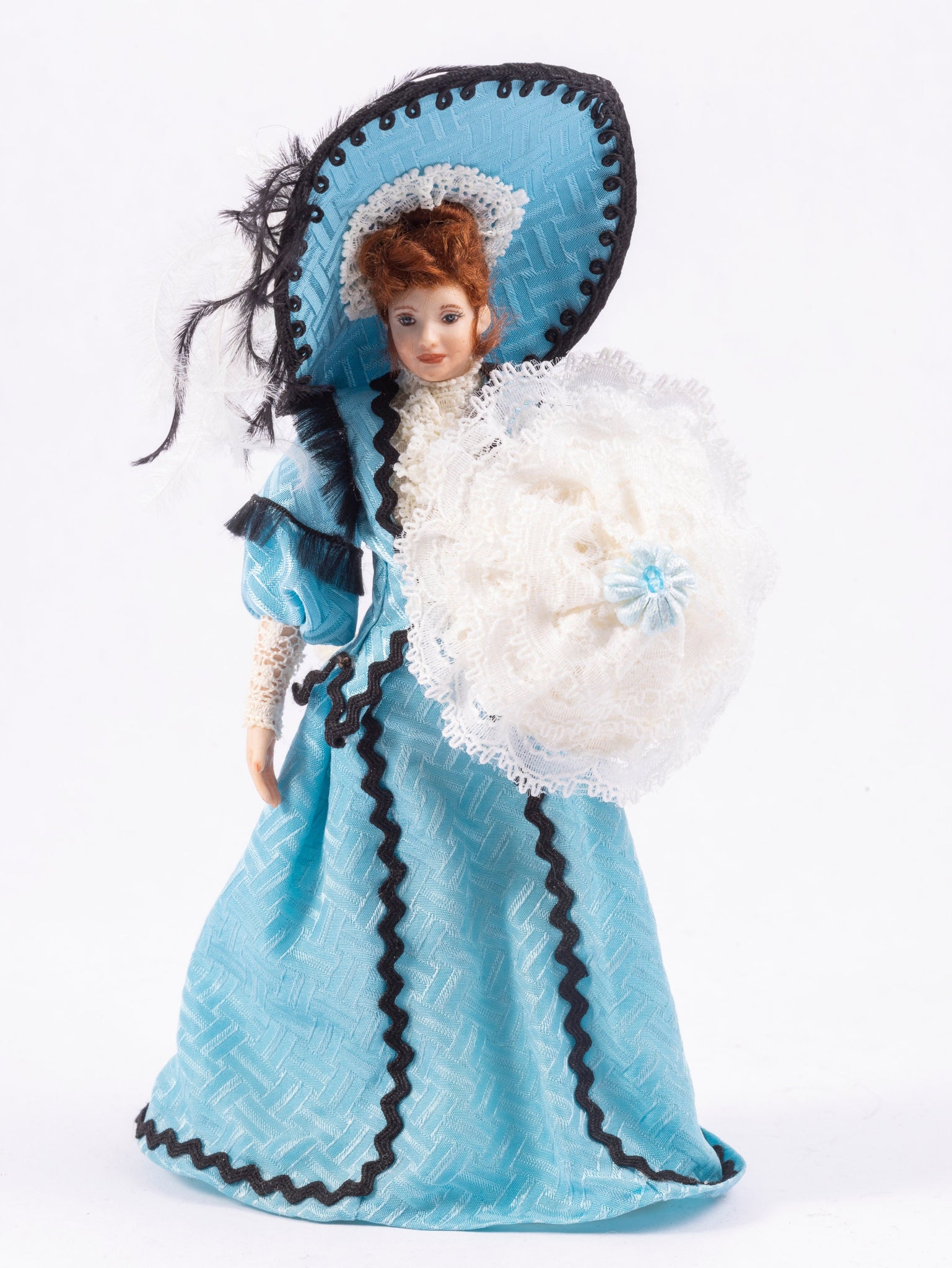 This is a terrific hand made porcelain doll of with red hair, long 1900's dress and matching hat. Lovely with lace and parasol. Beautiful face, Victorian boots.