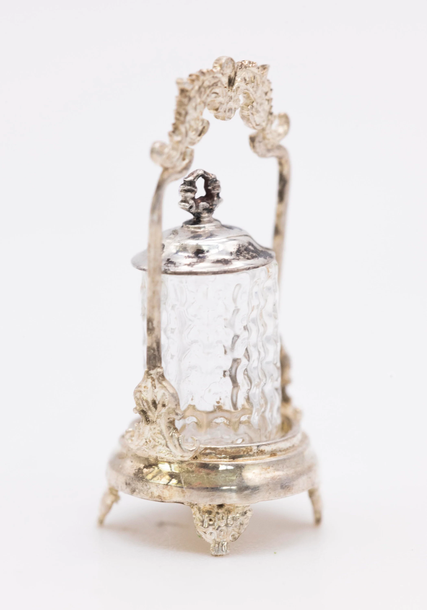 This is a handmade beautiful sterling silver limited edition pickle castor. This does not have a pair of tongs, and is reduced because of that.