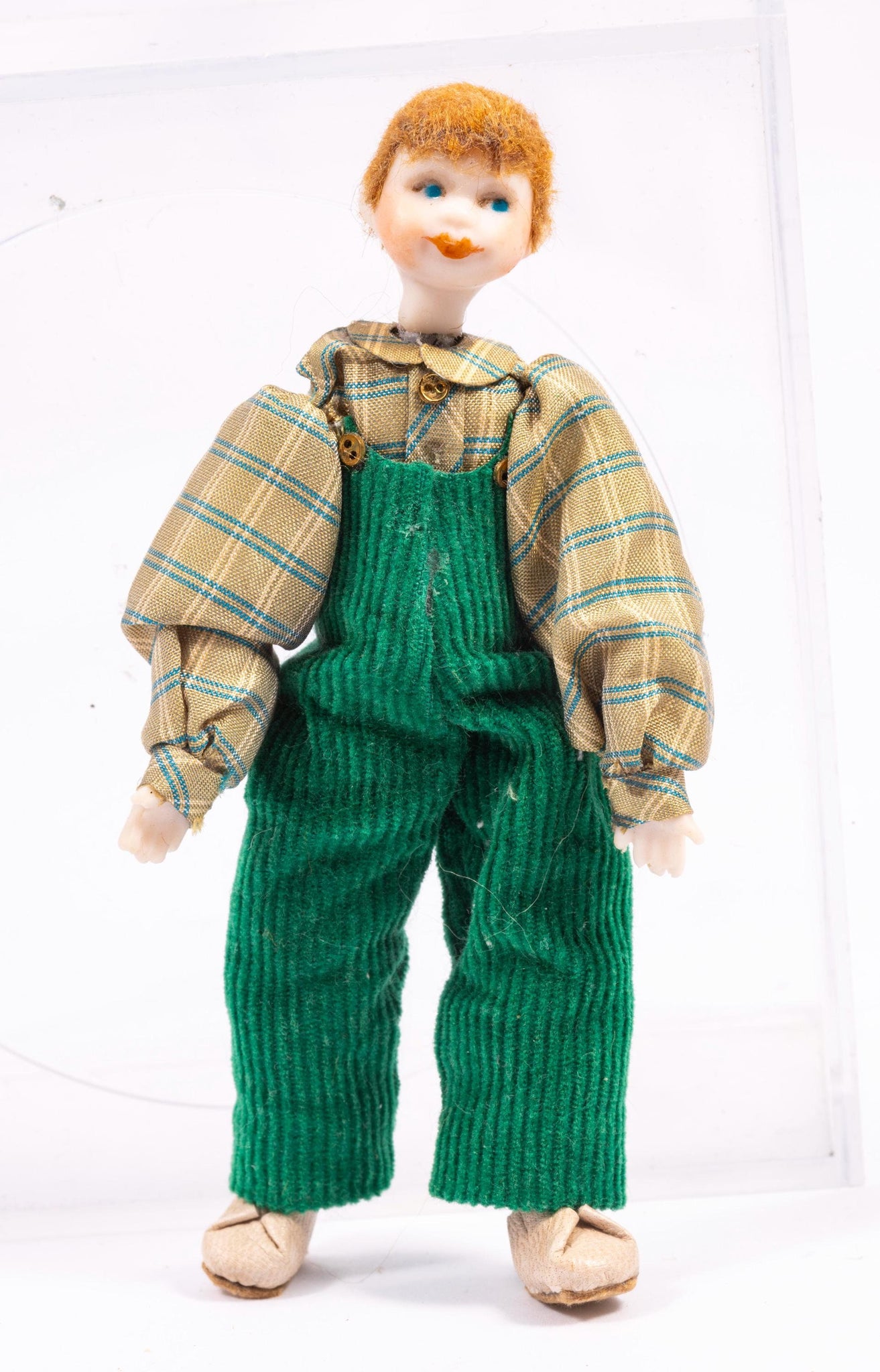 **Dollhouse Miniatures, 1:12 scale** This is an artisan made doll by Pat Melvin. This doll is a little boy with strawberry blonde hair wearing green overalls and a green checkered shirt.