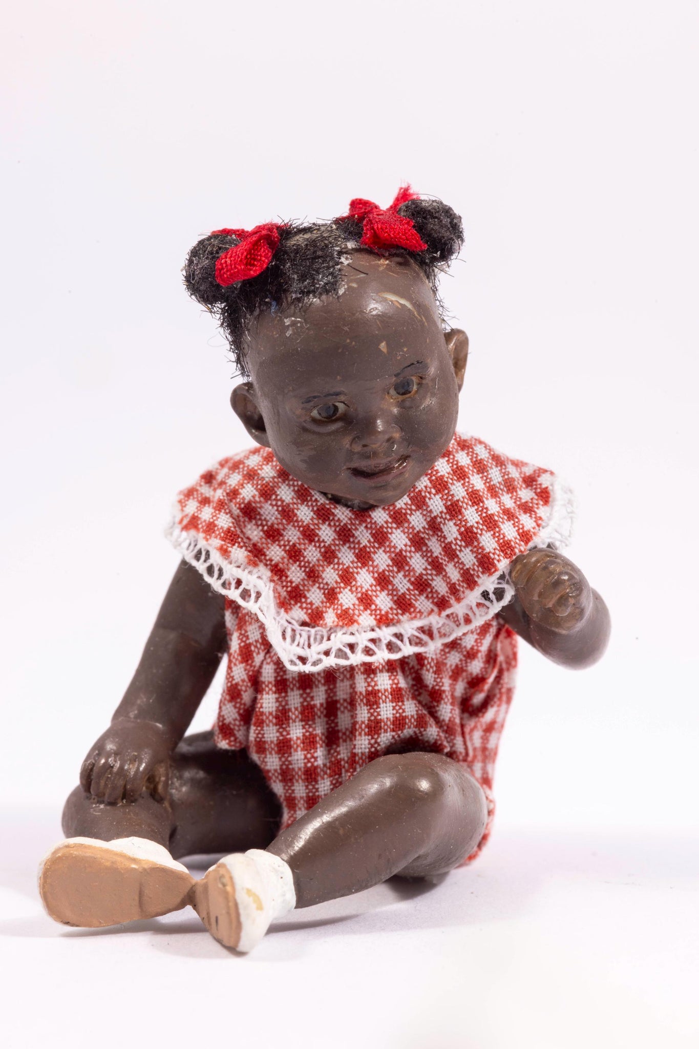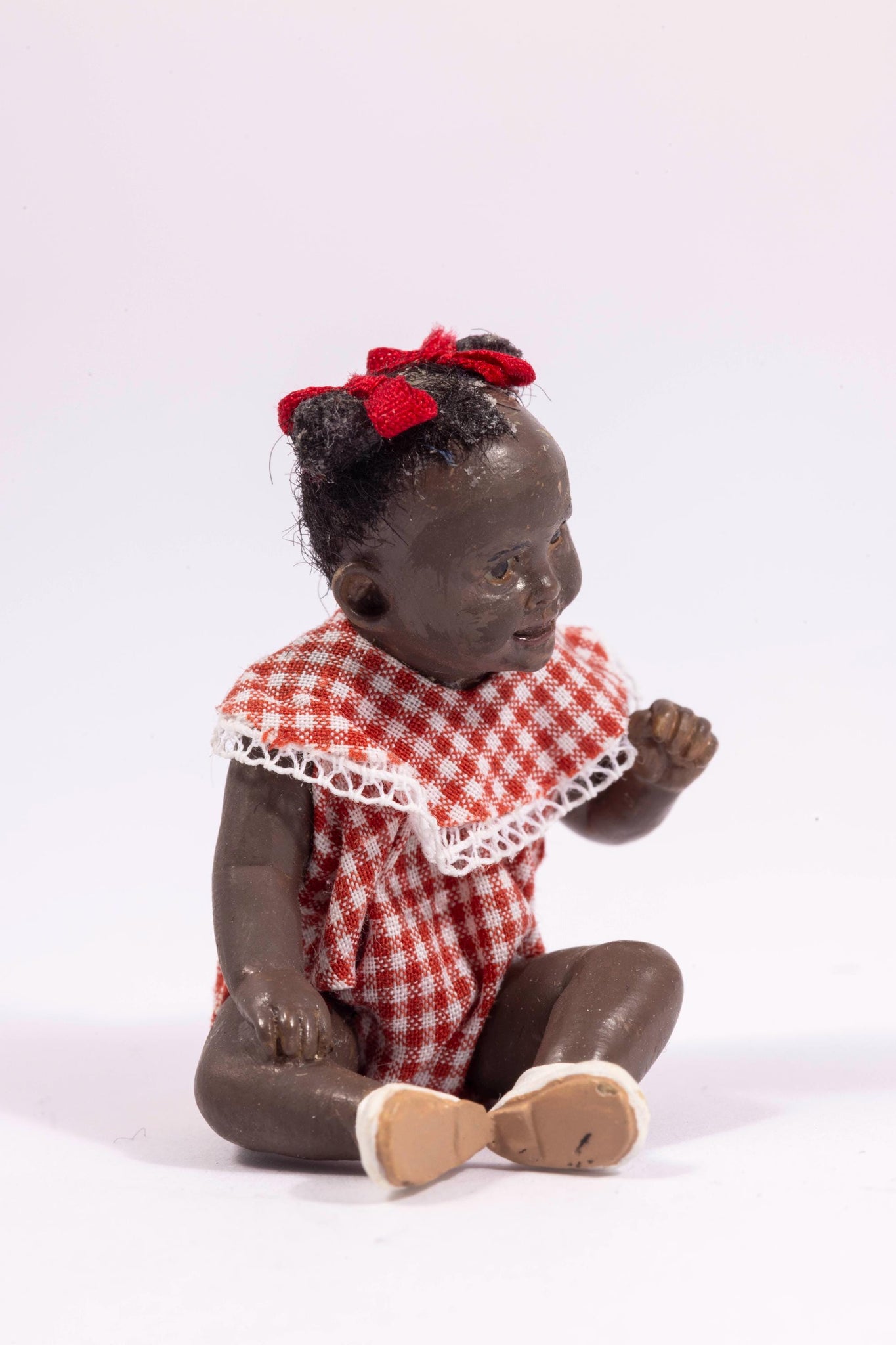 This is a Susan Scogin African American little girl doll. She's wearing a red checkered outfit with little white baby shoes. So cute, and no longer available.