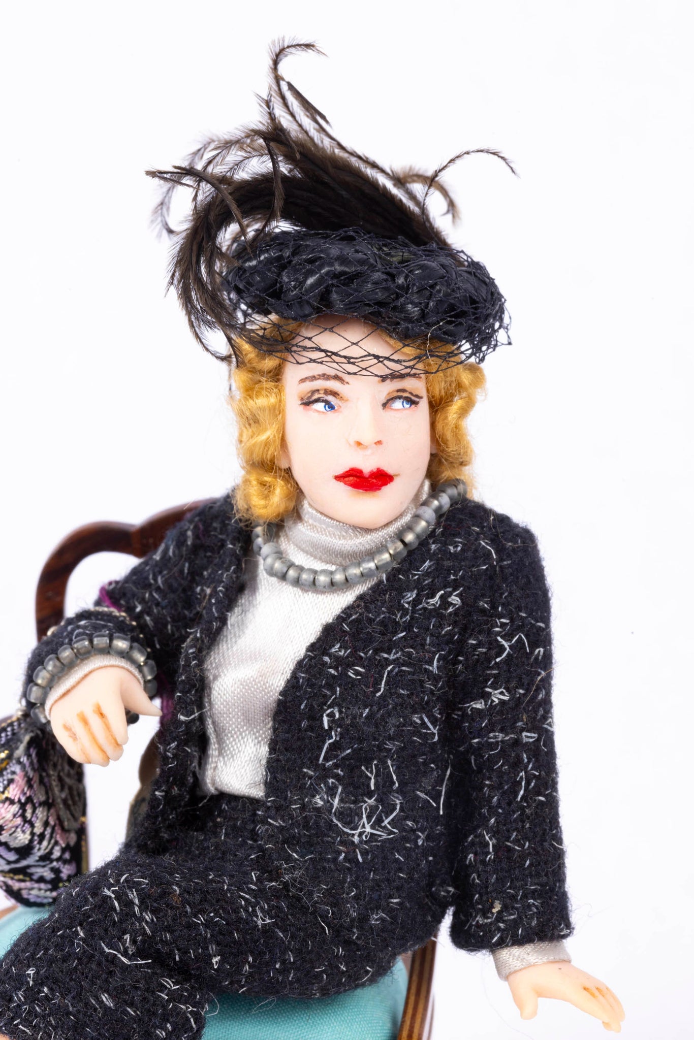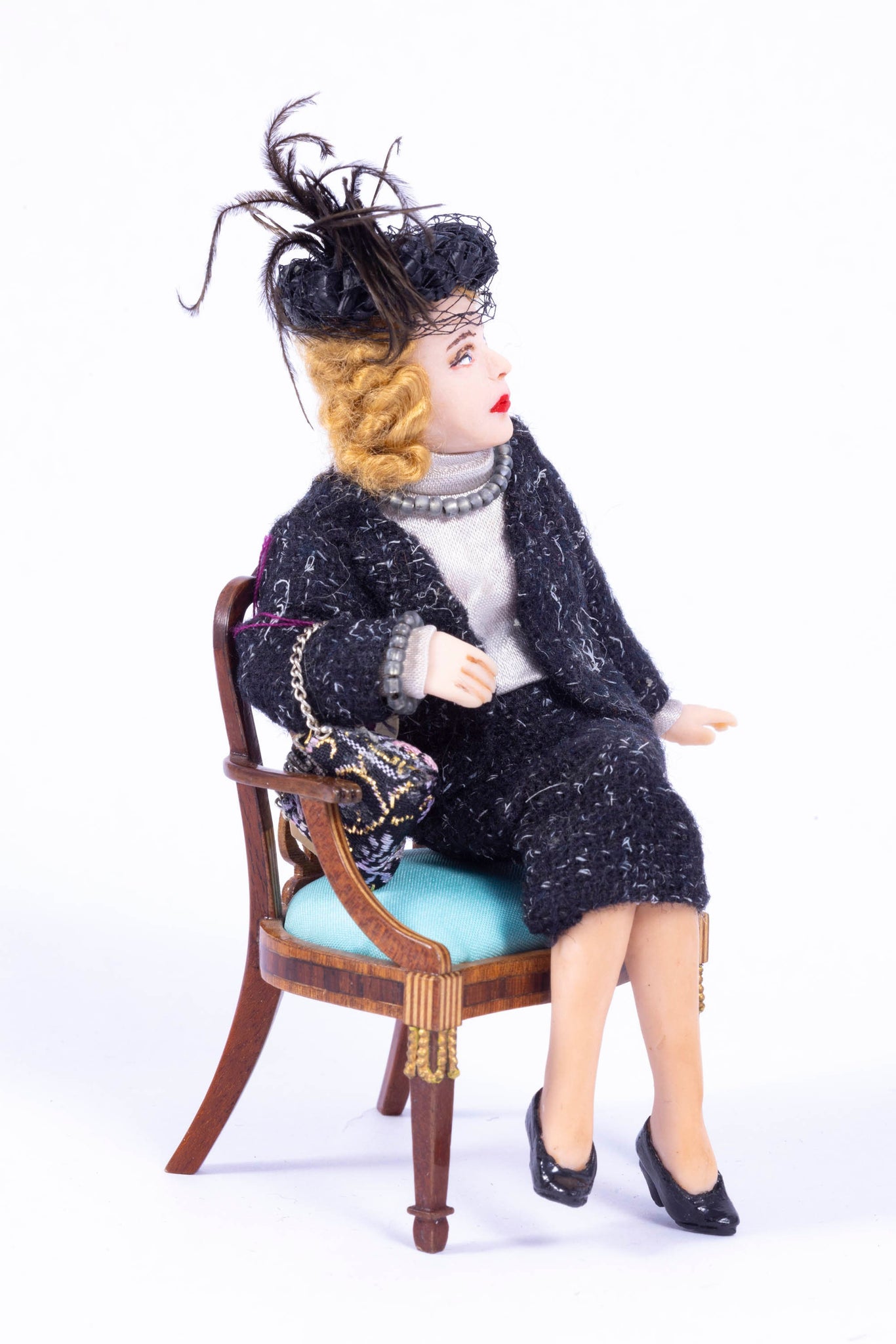 This is a hand sculpted doll in a black dress with matching hat and purse. She was made by Twin Minis. She has a skirt and jacket with matching hat, and is in a sitting position. Blonde hair, jewelry and a purse. From upscale collection. Chair not included. Her index finger on her right hand is broken, after this photo was taken. Now on sale.