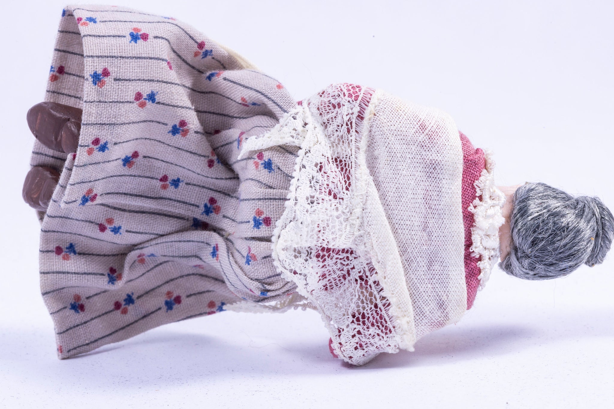 This is a hand made sculpted doll by Twin Minis. This older lady is in a sitting position, wearing a dress and is holding a glass. Sofa not included.