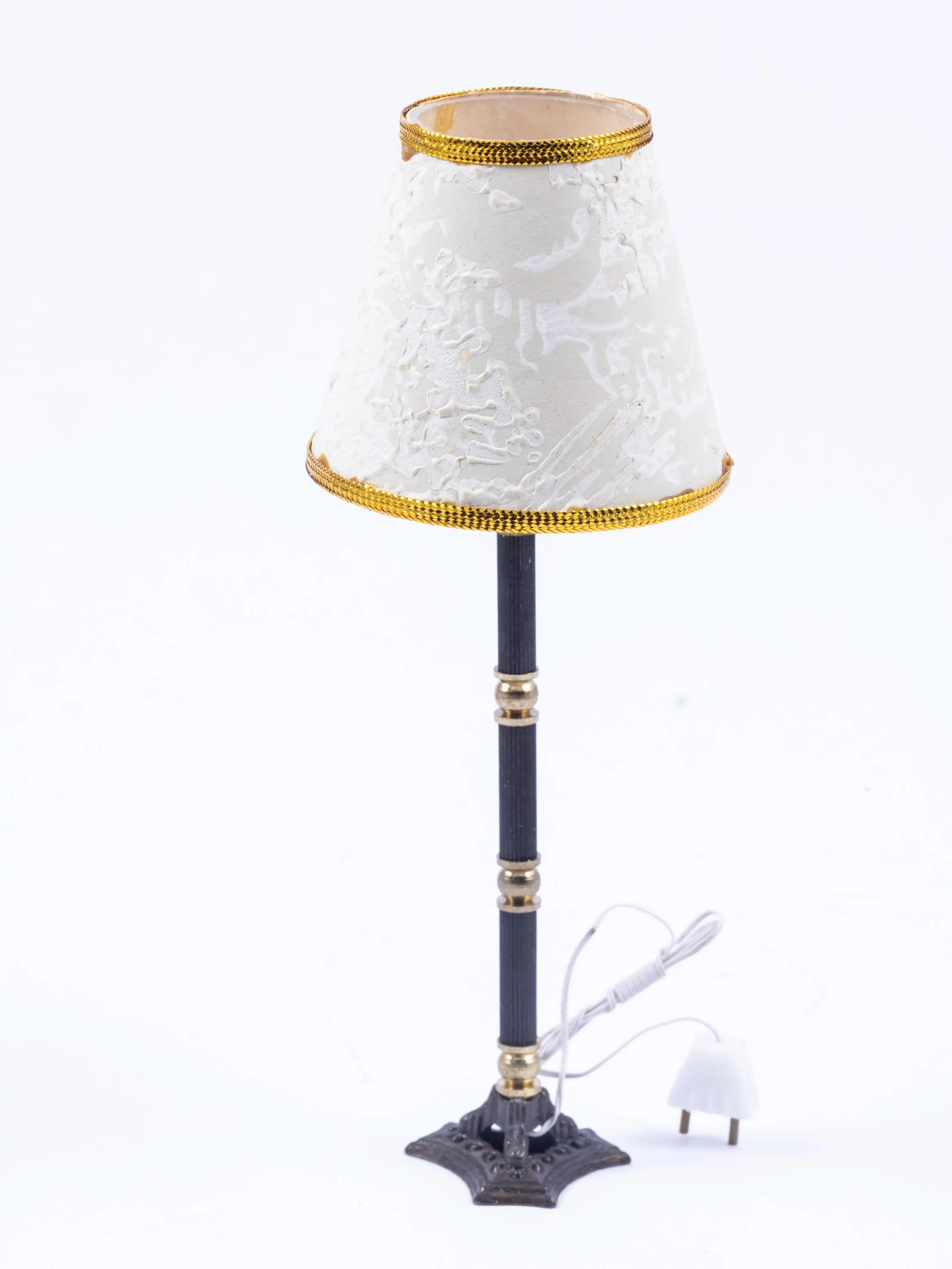 This is a 12 volt floor lamp with a brown and gold base, white and gold shade. Vintage.