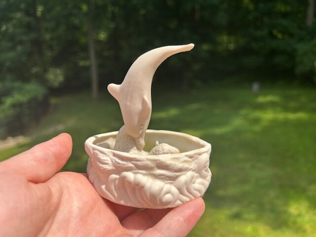 This is a porcelain fountain pond with a dolphin statue in the middle.