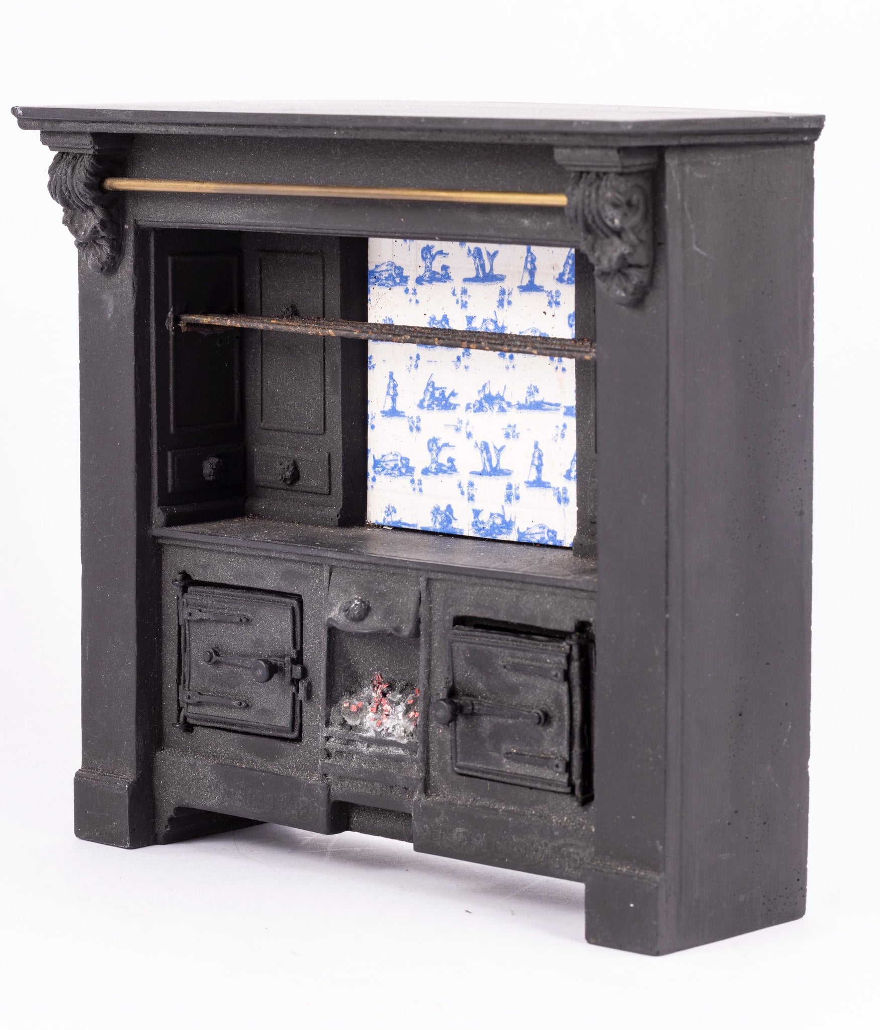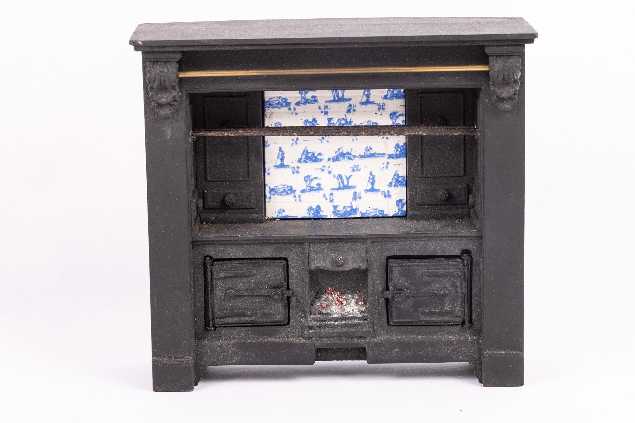 This is a Hearth and Home, UK made stove. Metal and resin made with brass rack above. Blue and white back. You can put a bulb underneath to make the coals glow. This collection that I am selling is from the Ursula Sauerberg estate.
