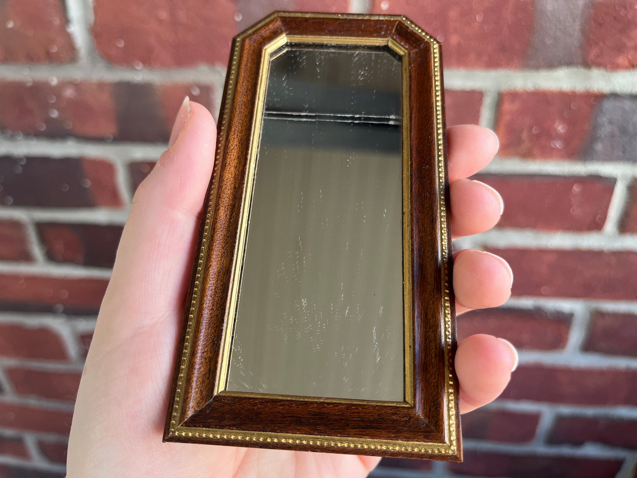 This is a vintage tall mirror by Roger Gutheil from 1981. This mirror has a wooden frame with painted gold accents.