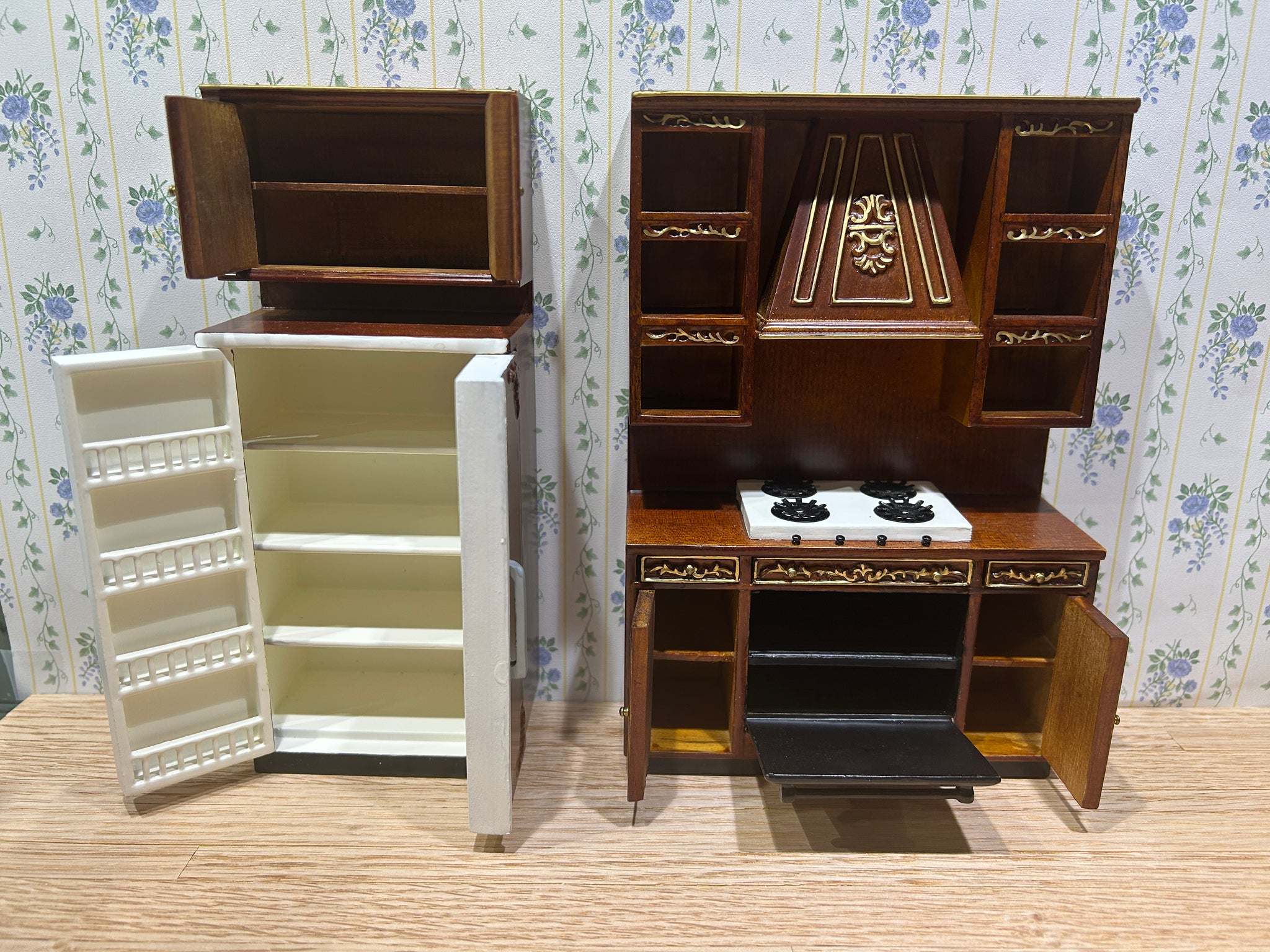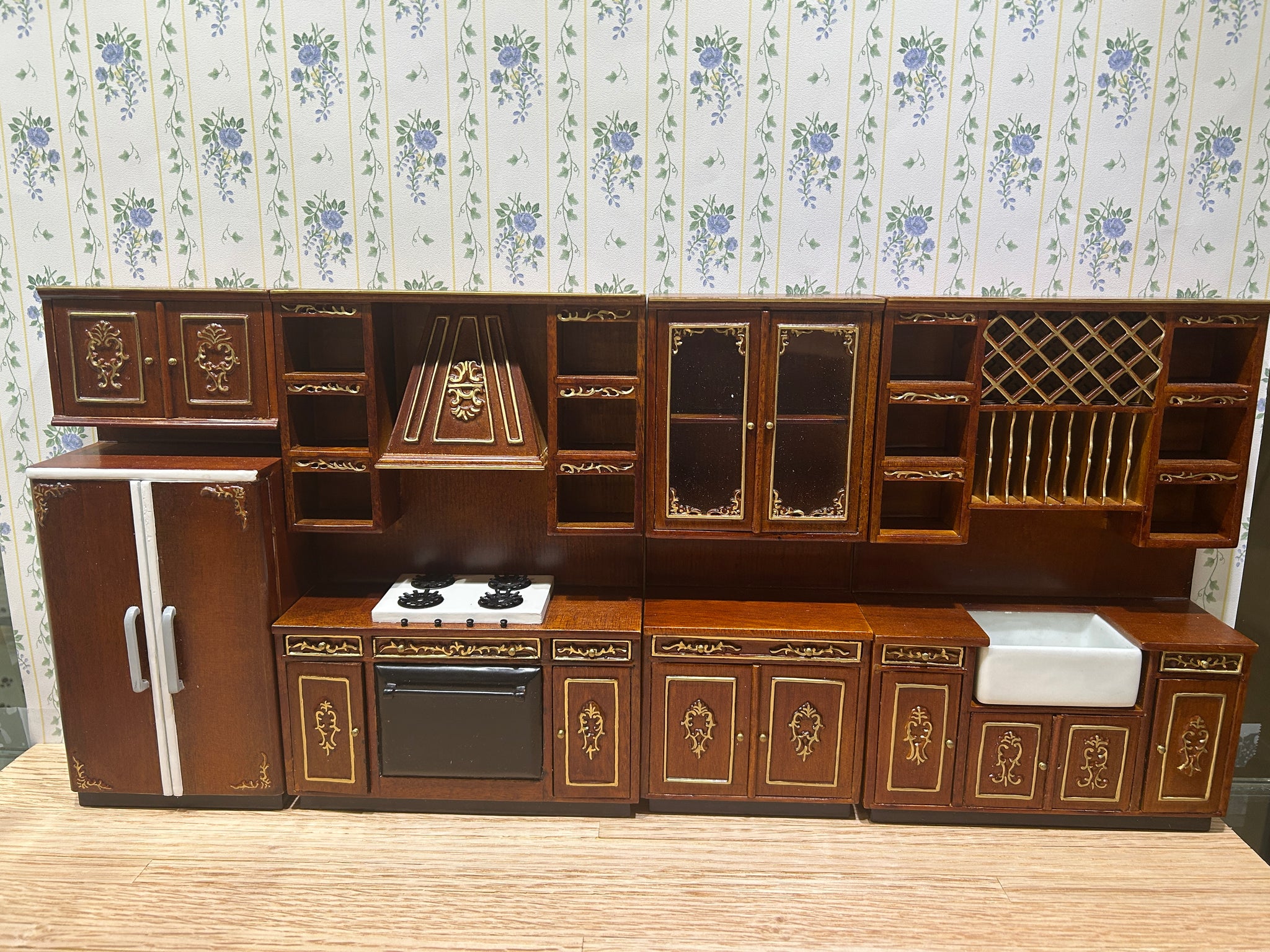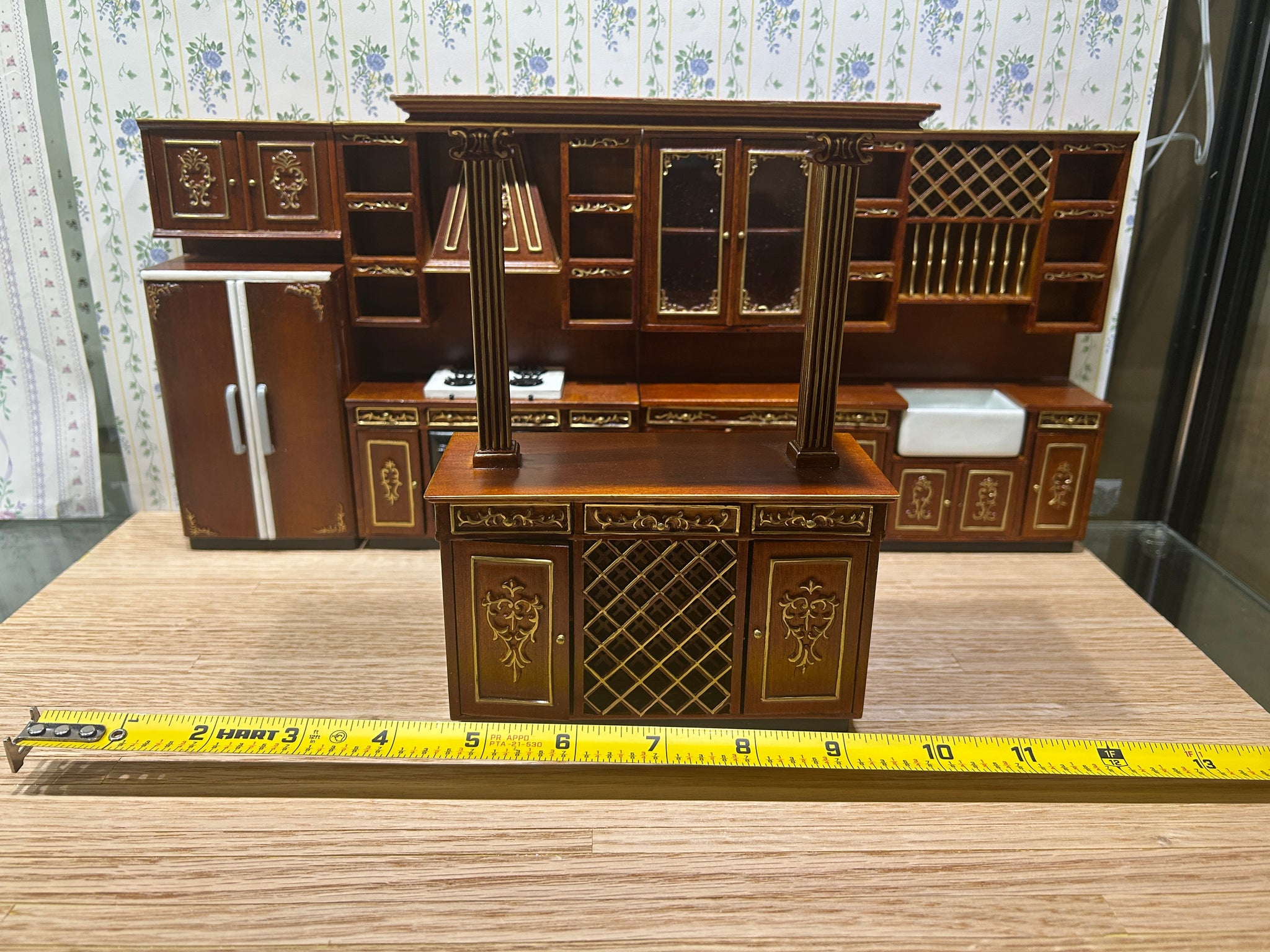 5 piece kitchen set from Hana Mini / Hansson. Includes kitchen island, stove, refrigerator, sink, and counter / cabinet piece. One handle from the cabinet under the sink unit is missing.