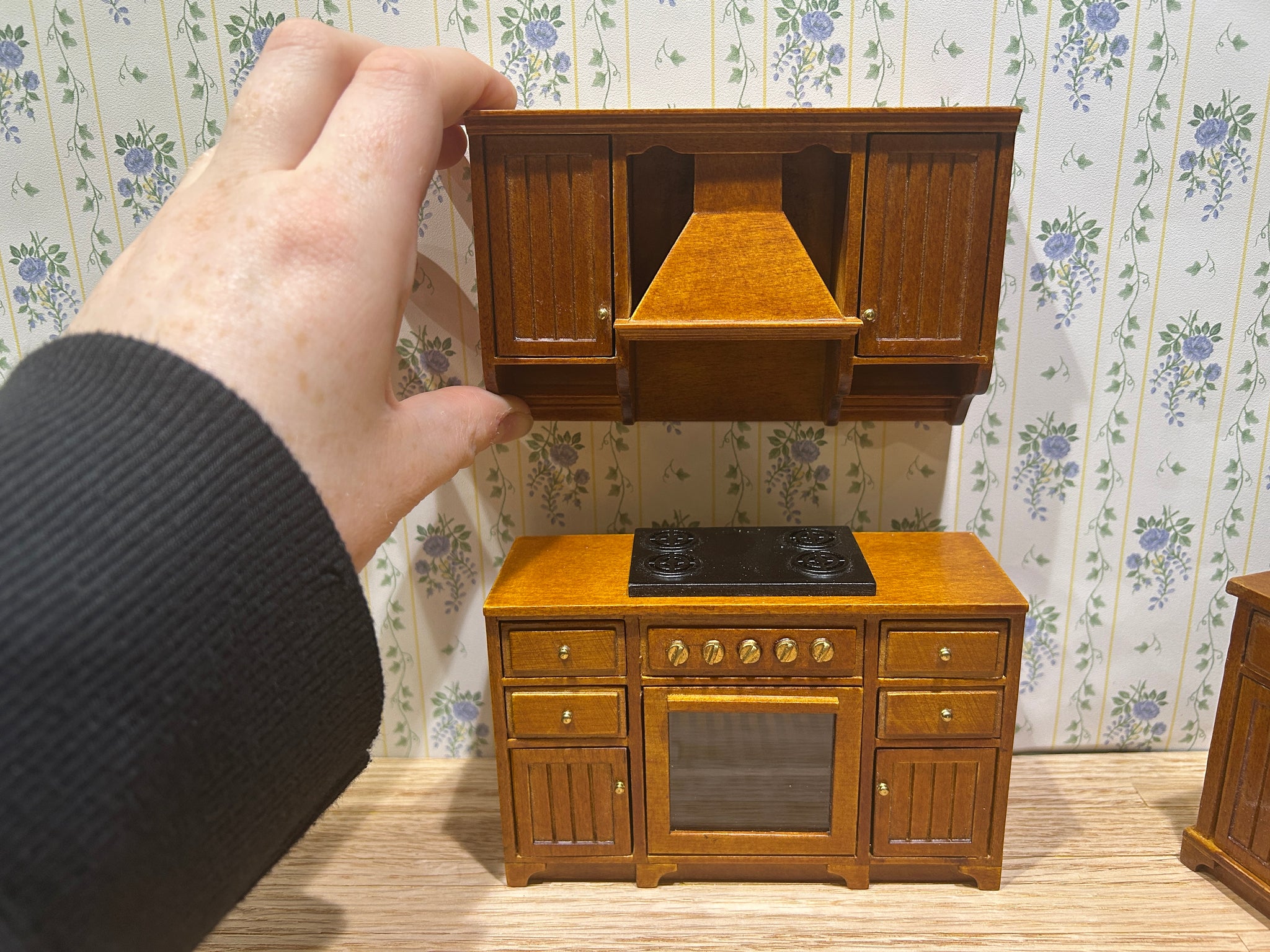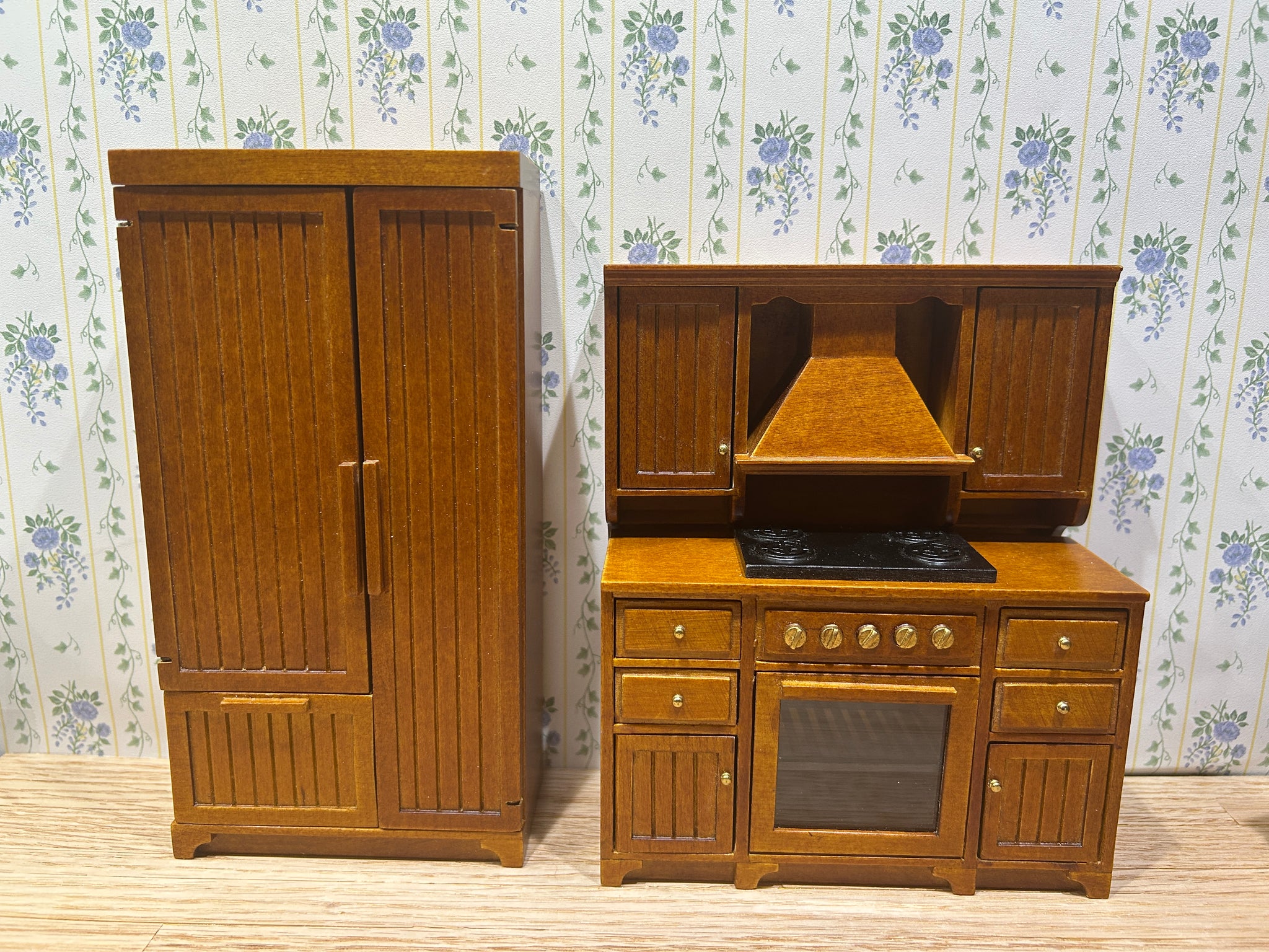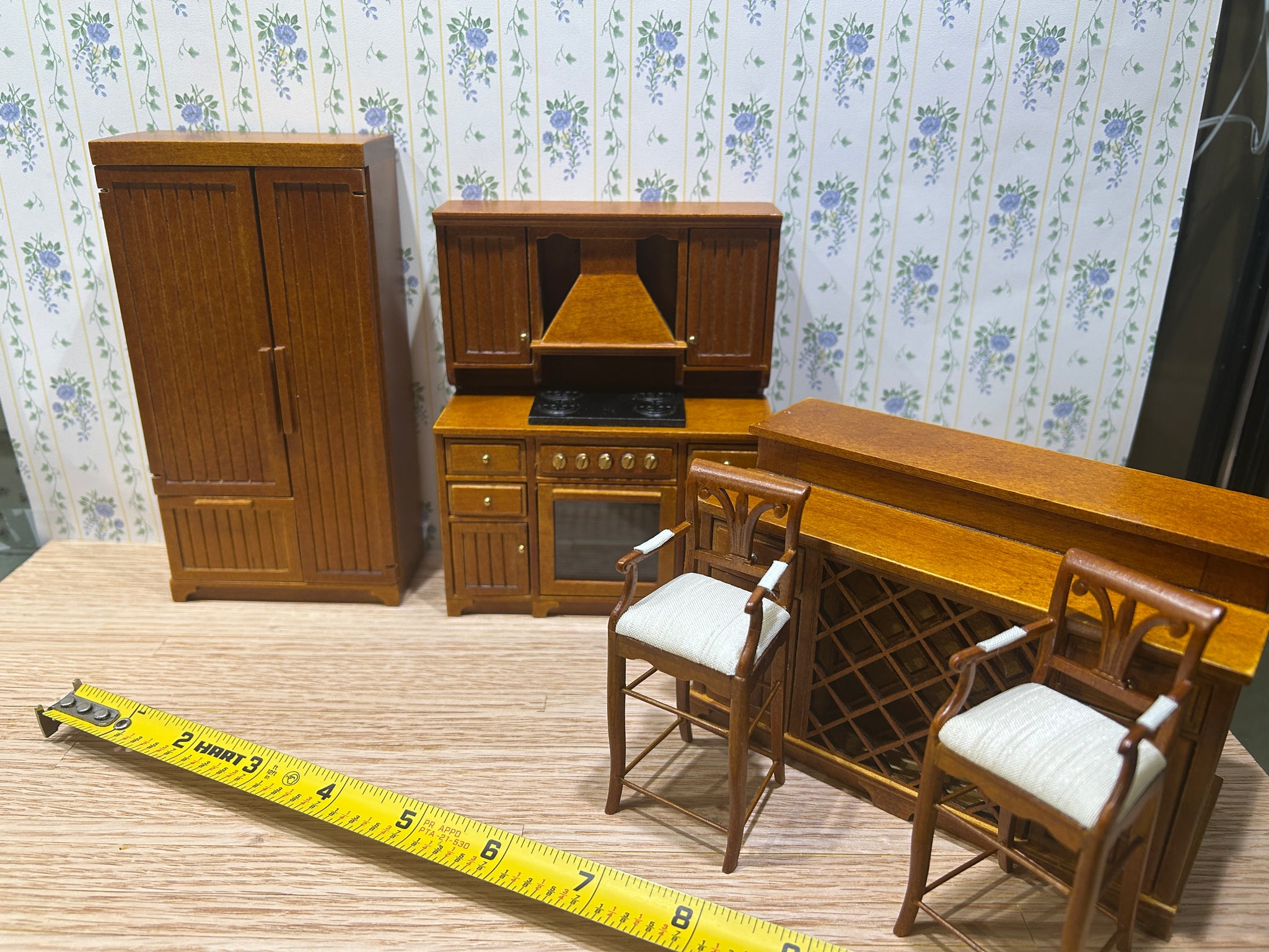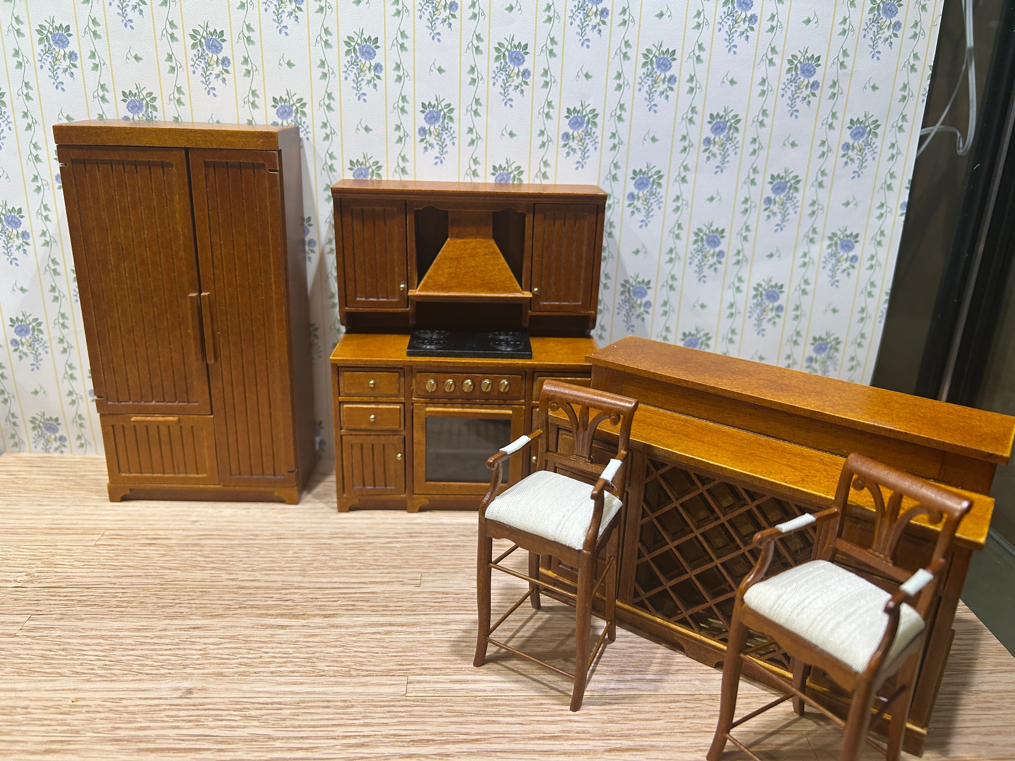 6 piece kitchen set from JBM. Includes stove, hood range, refrigerator, kitchen island, and two stools.