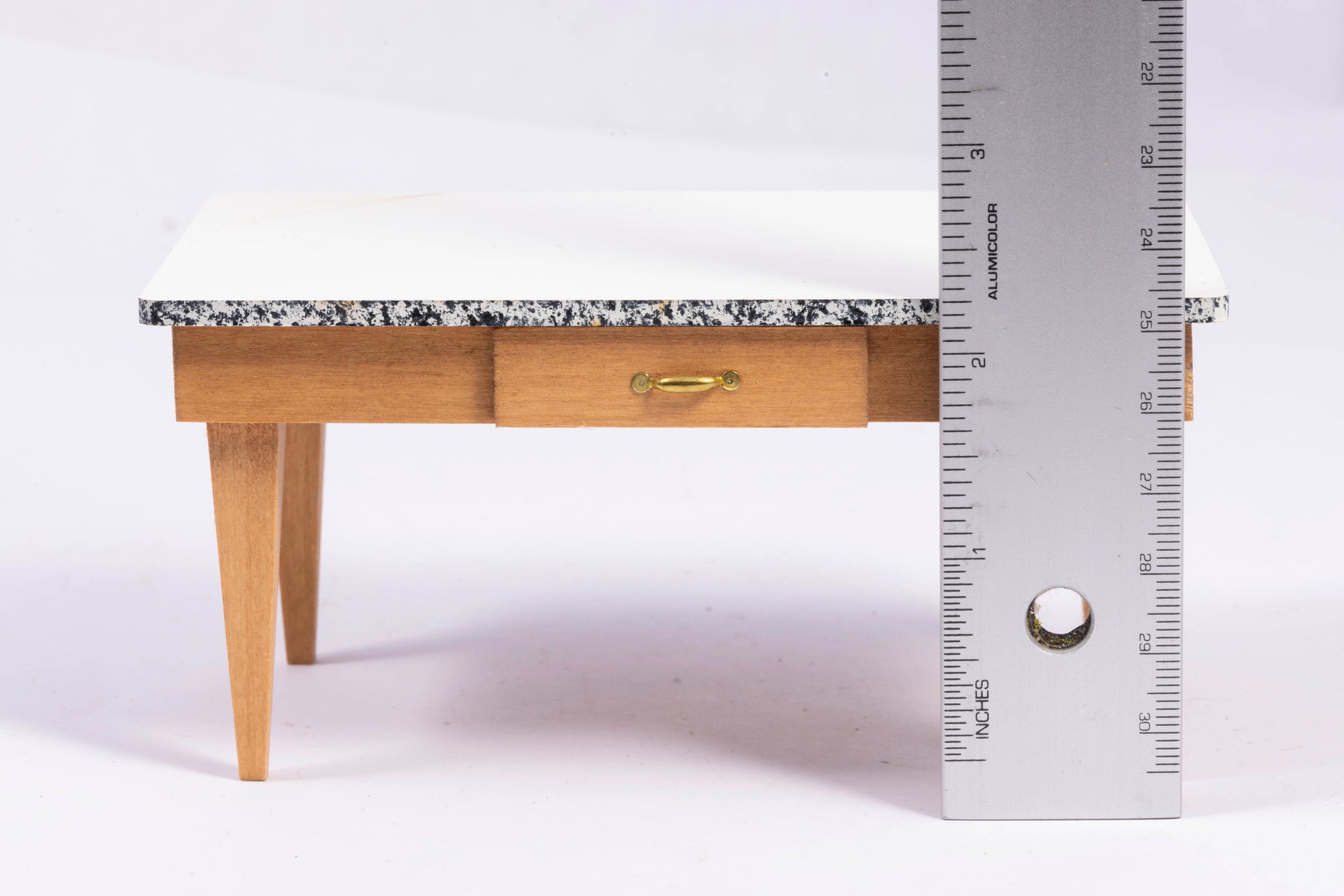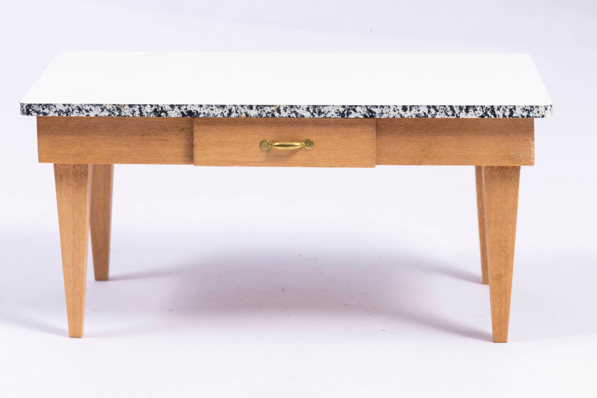 Wooden table with drawer for cutlery. White metal top. Just like the real ones!