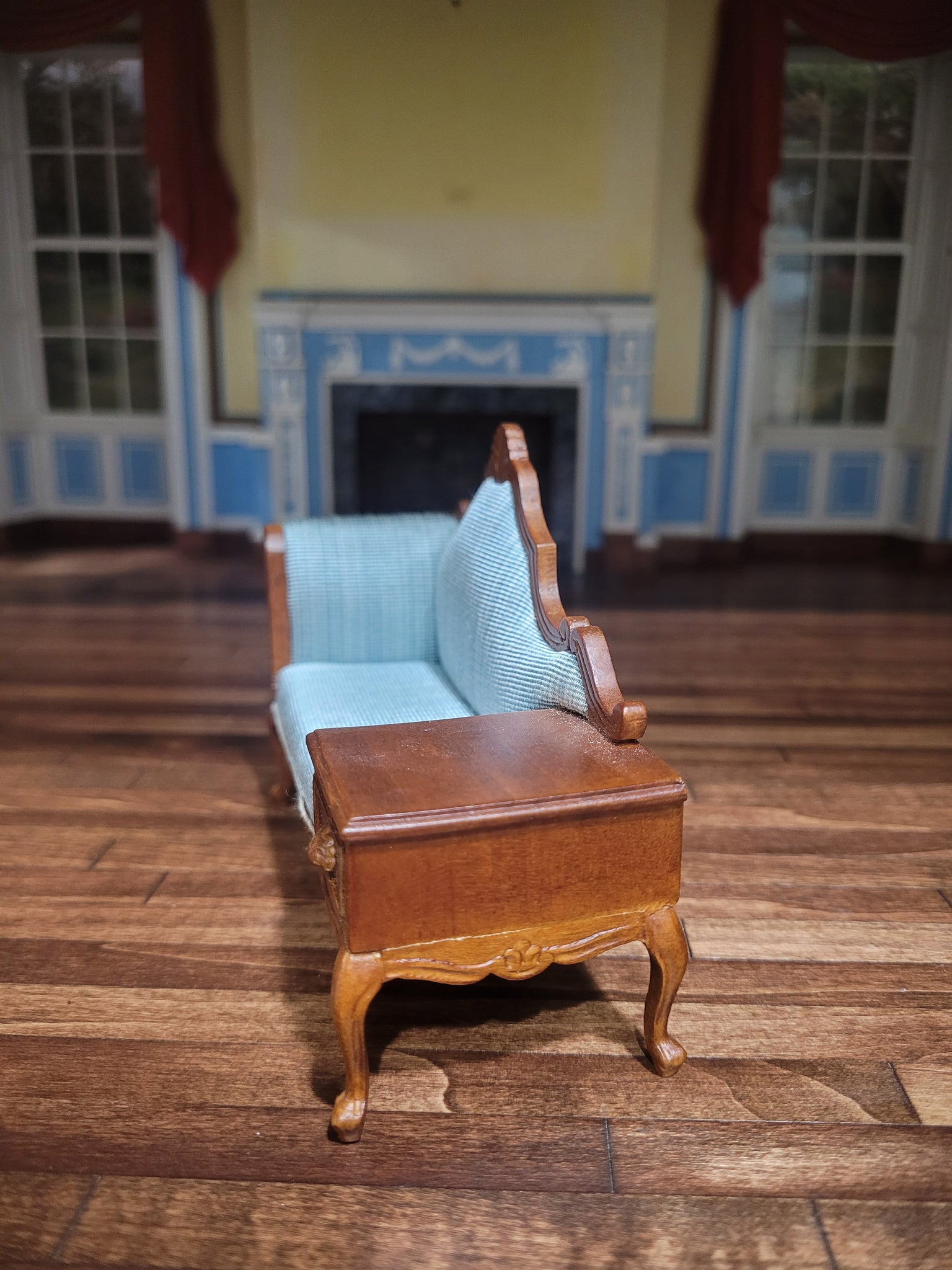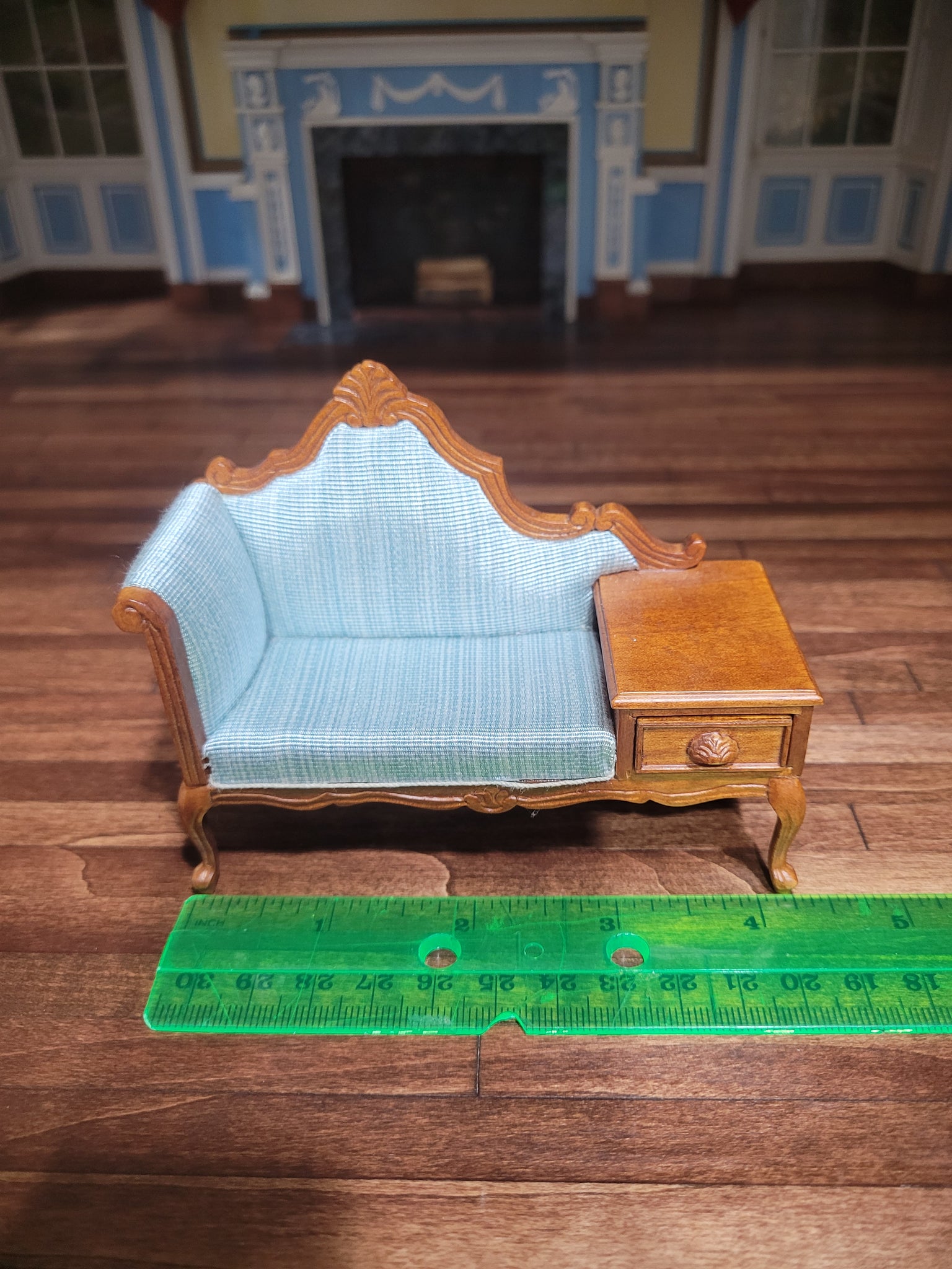 This is an Artisan-Made Light Blue & Oak Wooden Telephone Chair. Has a functional drawer with Scalloped Handle.