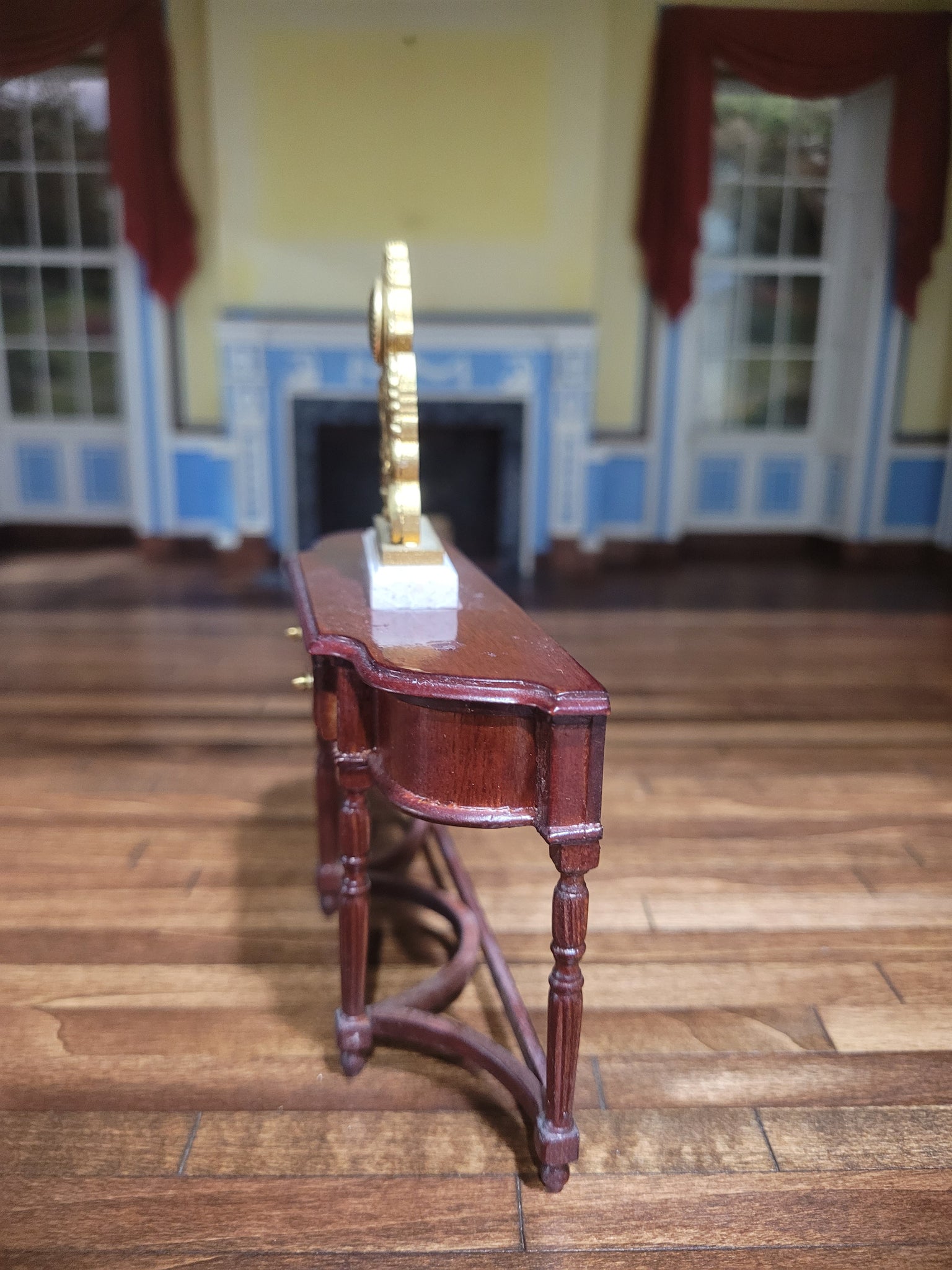 This is a Mahogany Hall Table with a Golden Clock Decoration on Top.