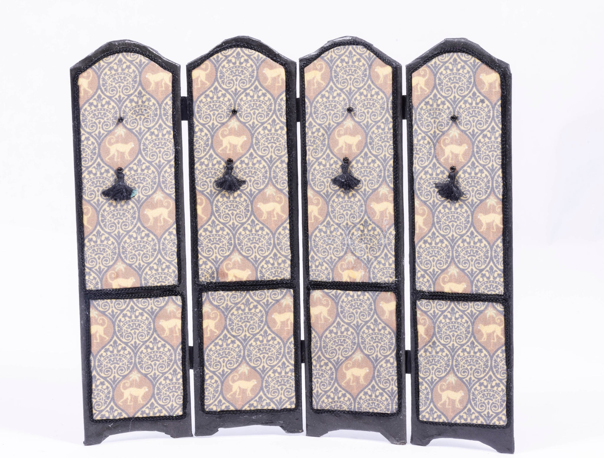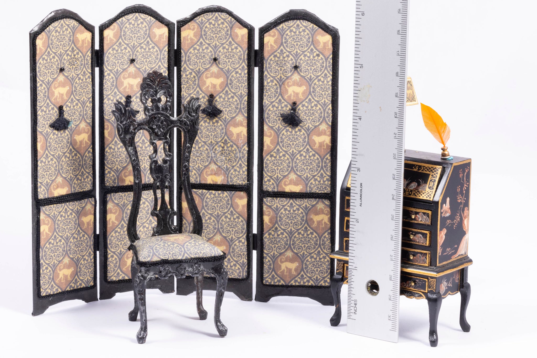 Desk with lamp and inkwell, Asian chair, four panel screen.