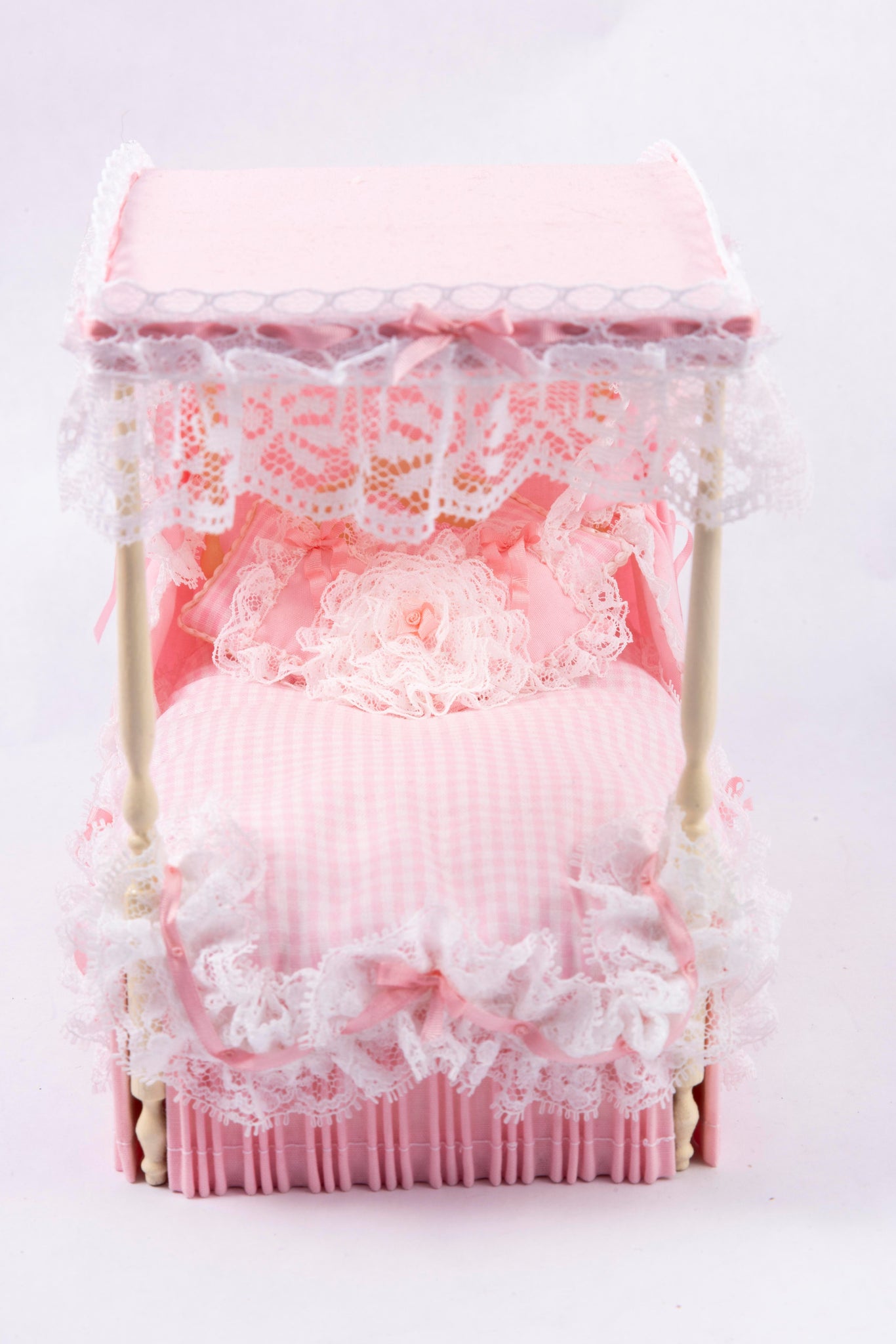 Adorable canopy bed with ruffled white lace. The blanket is pink and white gingham.